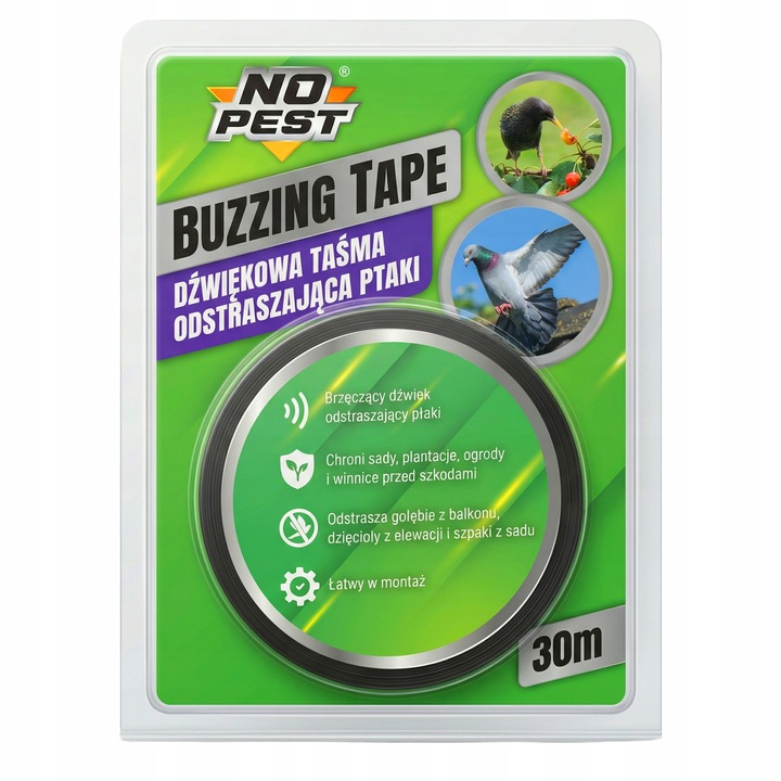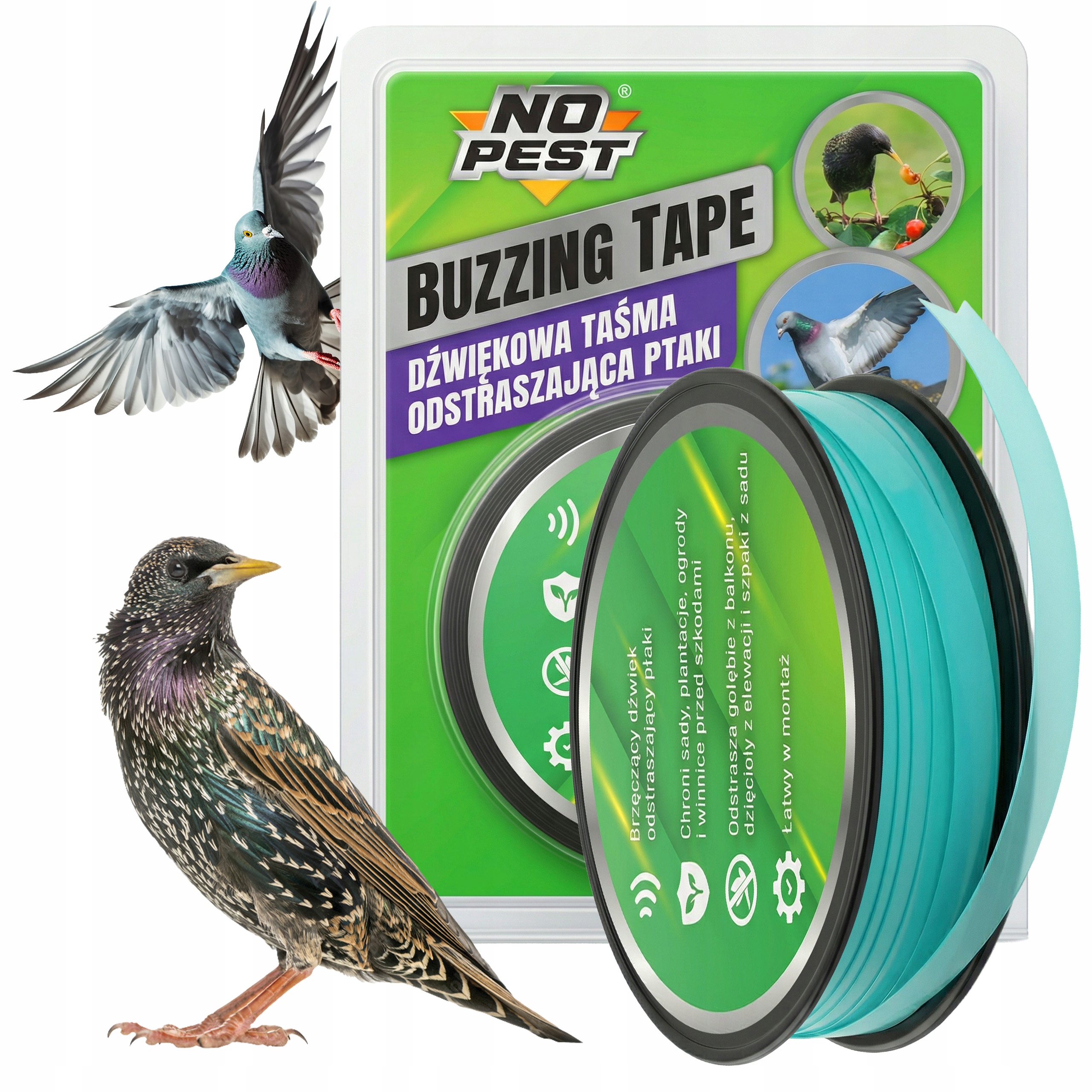Taśma na ptaki Buzzing Tape No Pest® 30 m to mechaniczny odstraszacz akustyczny przeznaczony do ograniczania przesiadywania ptaków (m.in. szpaków, gołębi i wron) w miejscach narażonych na zabrudzenia lub szkody. Może być stosowana m.in. w sadach, ogrodach, na plantacjach, a także na balkonach i tarasach wszędzie tam, gdzie ptaki regularnie żerują lub przesiadują.