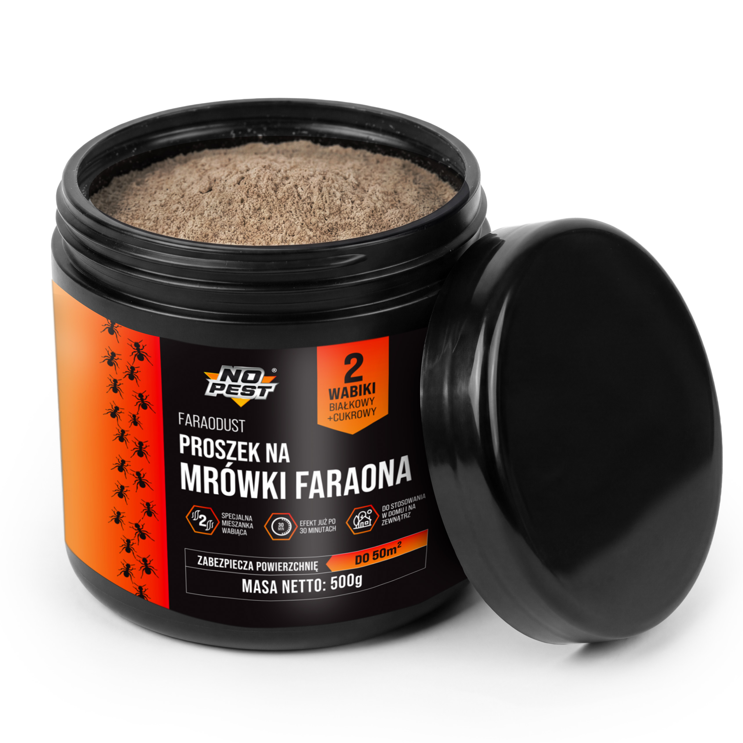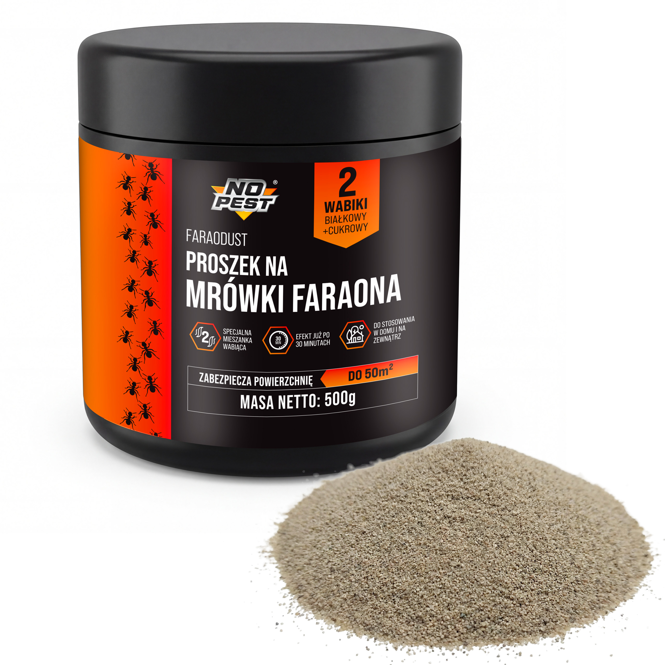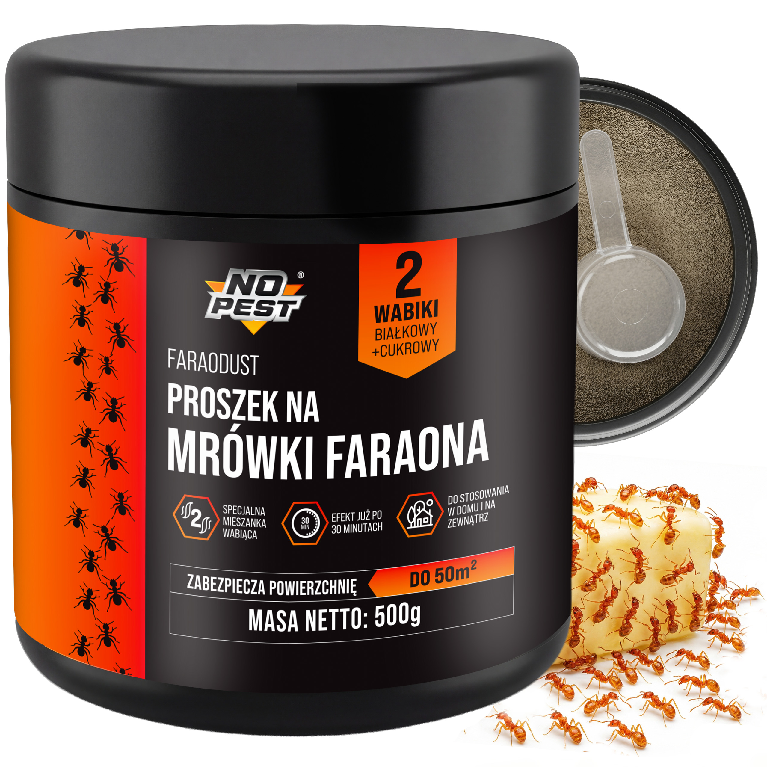 Mrówki faraona to wyjątkowo trudny przeciwnik. Tworzą rozbudowane sieci gniazd, dlatego tradycyjne spraye często powodują jedynie rozproszenie kolonii (tzw. budding). No Pest® Faraodust wykorzystuje zaawansowaną strategię pokarmową. Dzięki zastosowaniu dwóch rodzajów substancji nęcących – białkowej i cukrowej – preparat jest atrakcyjny dla mrówek na każdym etapie rozwoju larwalnego oraz dla królowych.