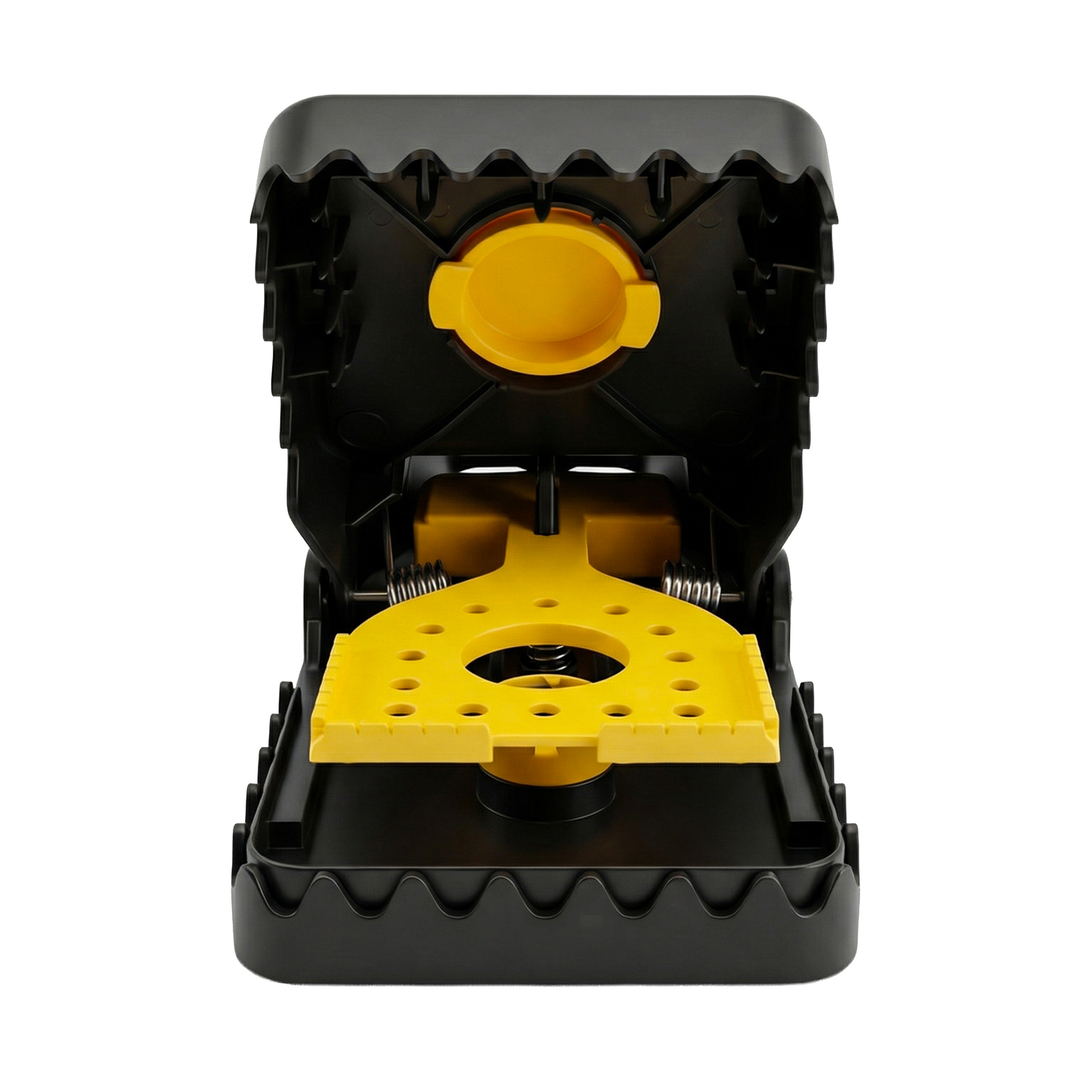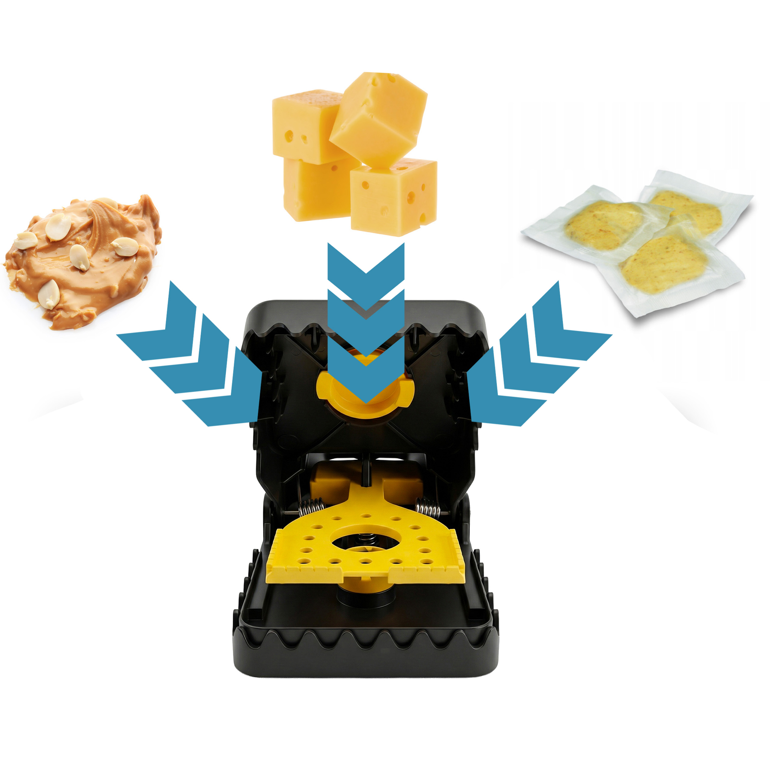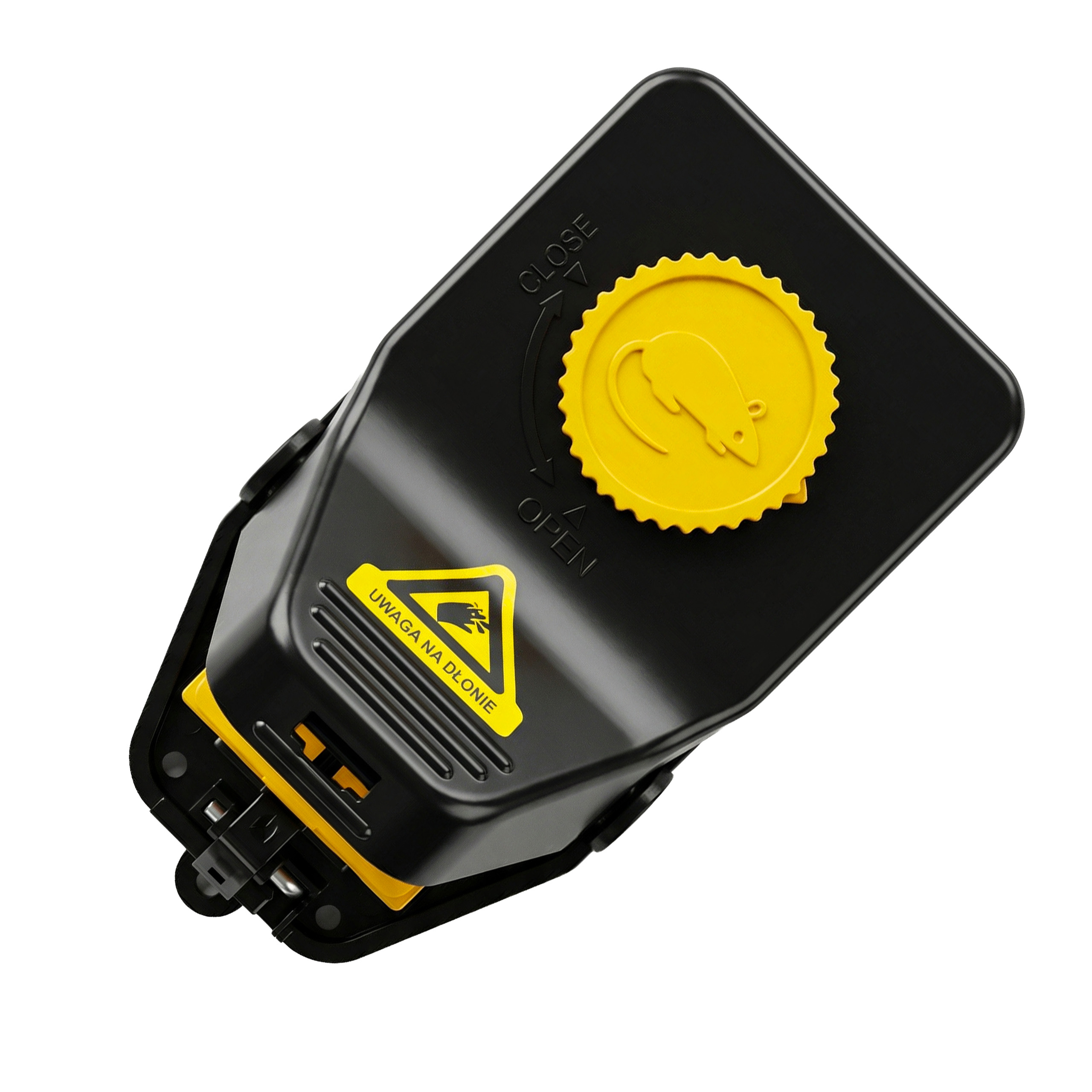 Zintegrowana komora na przynętę umożliwia jej aplikację bez kontaktu z zawartością – wystarczy odkręcić dolną część, umieścić przynętę i zamknąć pułapkę. Po zadziałaniu mechanizmu, gryzonia można usunąć bezdotykowo – za pomocą jednego nacisku spustu, bez konieczności kontaktu z jego ciałem.
