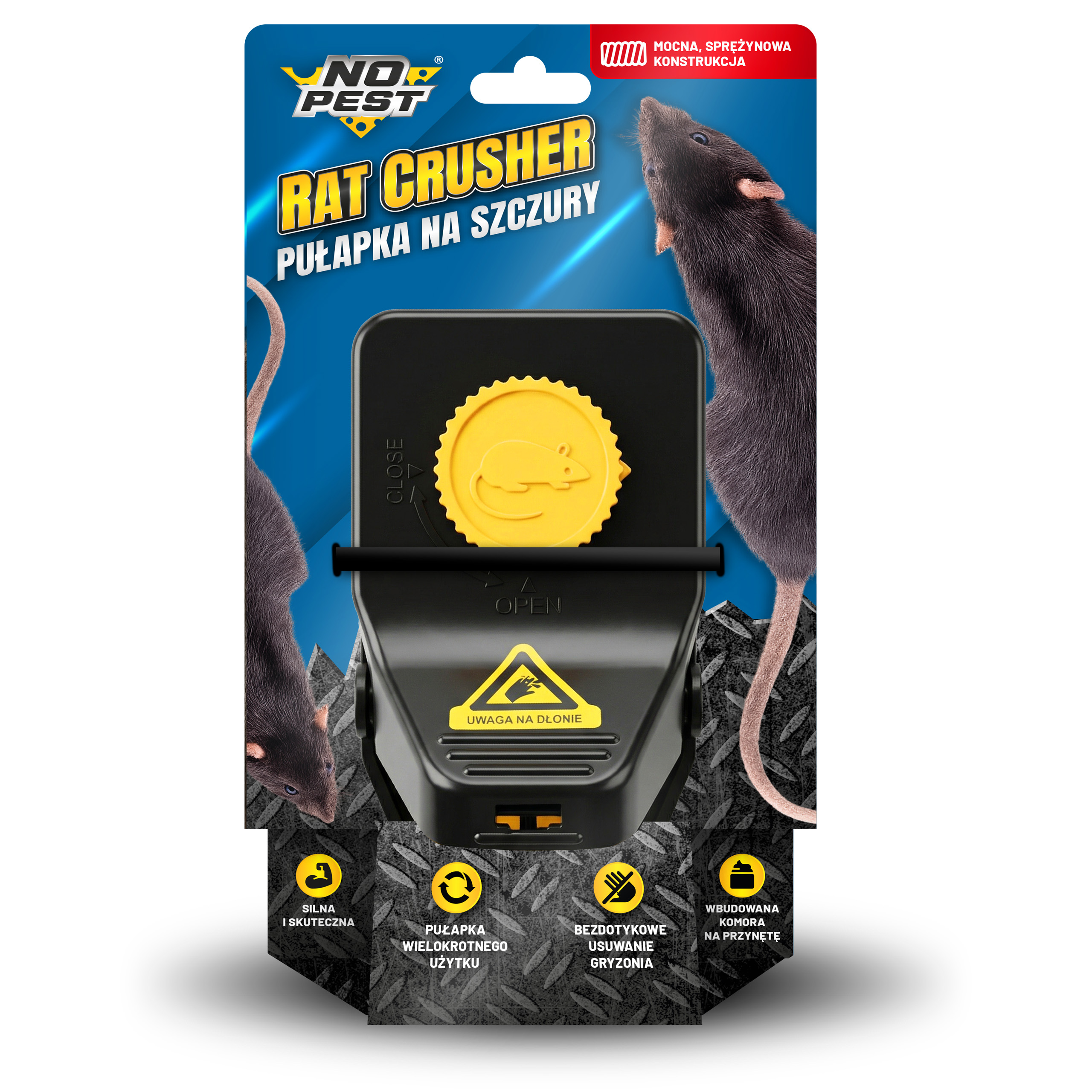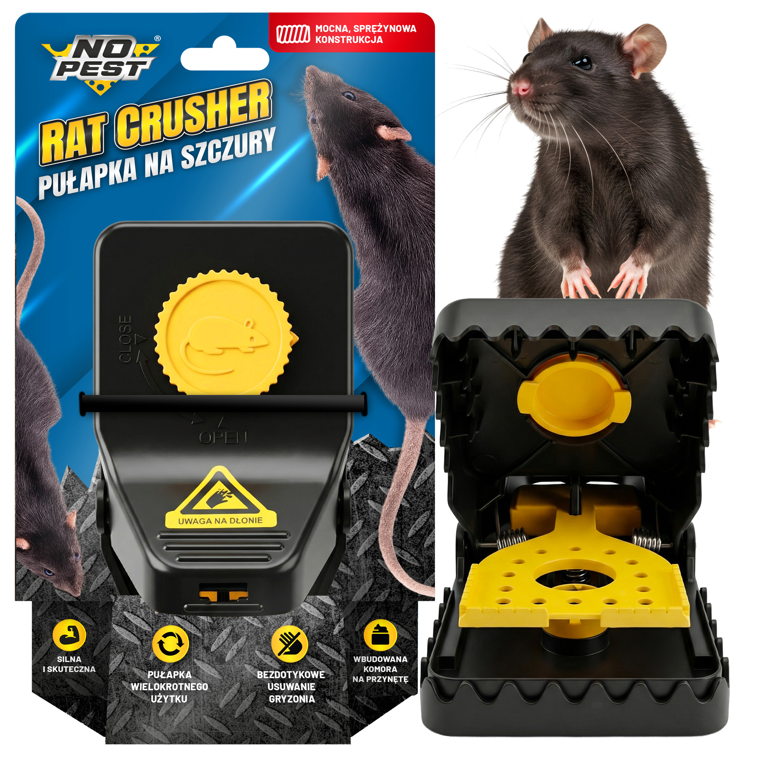 No Pest® Rat Crusher to solidna pułapka mechaniczna, przeznaczona dla użytkowników, którzy chcą ograniczyć obecność szczurów bez użycia trutek chemicznych. Wyposażona w silną sprężynę i wytrzymałą konstrukcję z tworzywa, działa natychmiast po uzbrojeniu – wystarczy ją ustawić w odpowiednim miejscu.