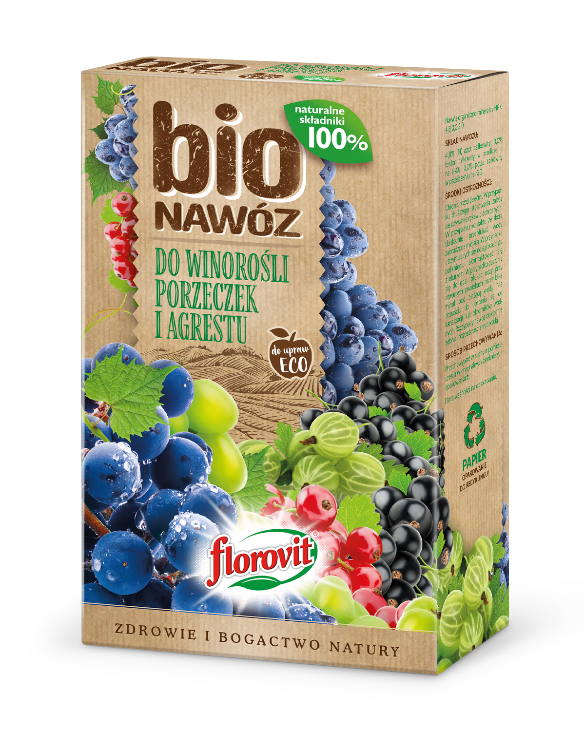 Florovit BIOnawóz przeznaczony jest do nawożenia winorośli, porzeczek i agrestu uprawianych w ogrodach przydomowych, działkowych oraz w sadach. Dzięki zawartości substancji organicznych nawóz poprawia właściwości gleby, zwłaszcza w miejscach ubogich w próchnicę, zwiększa jej zdolność do zatrzymywania wody i ułatwia roślinom pobieranie składników pokarmowych z podłoża.