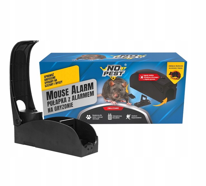 Elektryczna pułapka na myszy z alarmem No Pest® Mouse Alarm SX-5052 to urządzenie przeznaczone do mechanicznego wyłapywania myszy, szczurów oraz innych gryzoni wewnątrz pomieszczeń. Konstrukcja opiera się na zamkniętym mechanizmie zapadkowym, który po uruchomieniu informuje użytkownika o aktywacji sygnałem dźwiękowym i świetlnym.