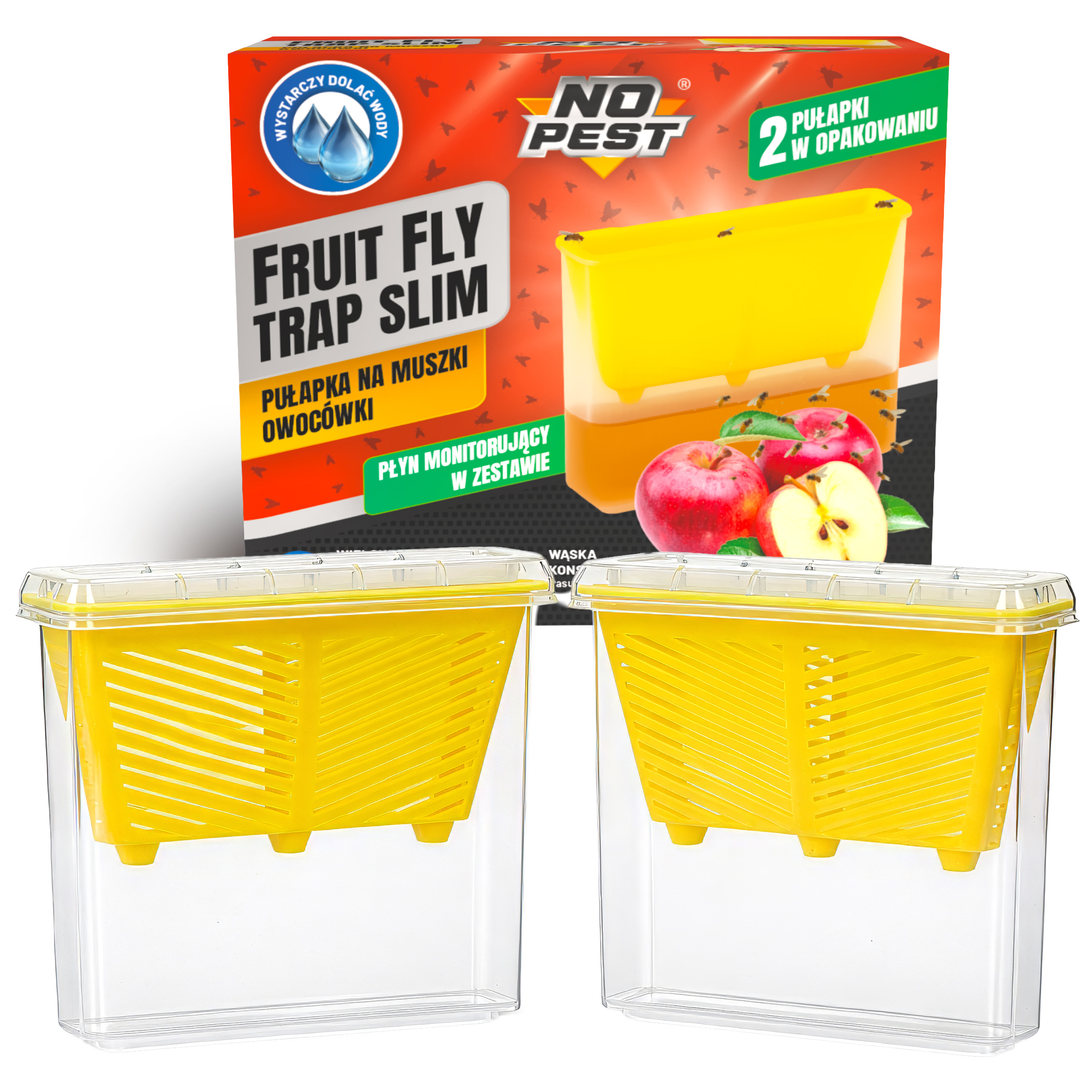 Fruit Trap Slim No Pest® to nowoczesne i estetyczne rozwiązanie do monitorowania obecności muszki owocowej (Drosophila melanogaster) w pomieszczeniach. Jej smukła forma pozwala na umieszczenie w trudno dostępnych miejscach. Wystarczy uzupełnić pułapkę odpowiednim atraktantem i wodą, aby rozpocząć jej działanie. Konstrukcja pułapki umożliwia przyciąganie i zatrzymywanie muszek owocowych.