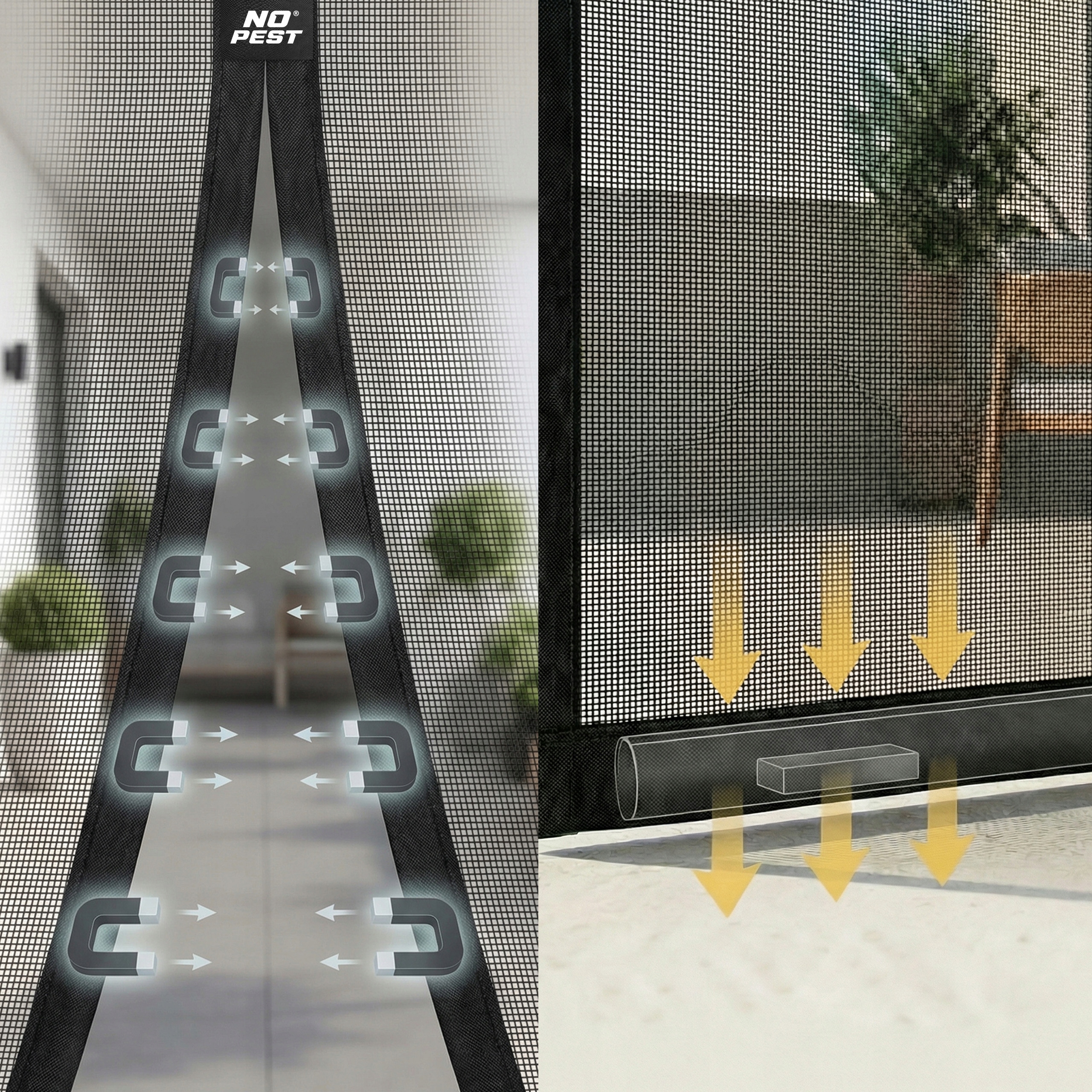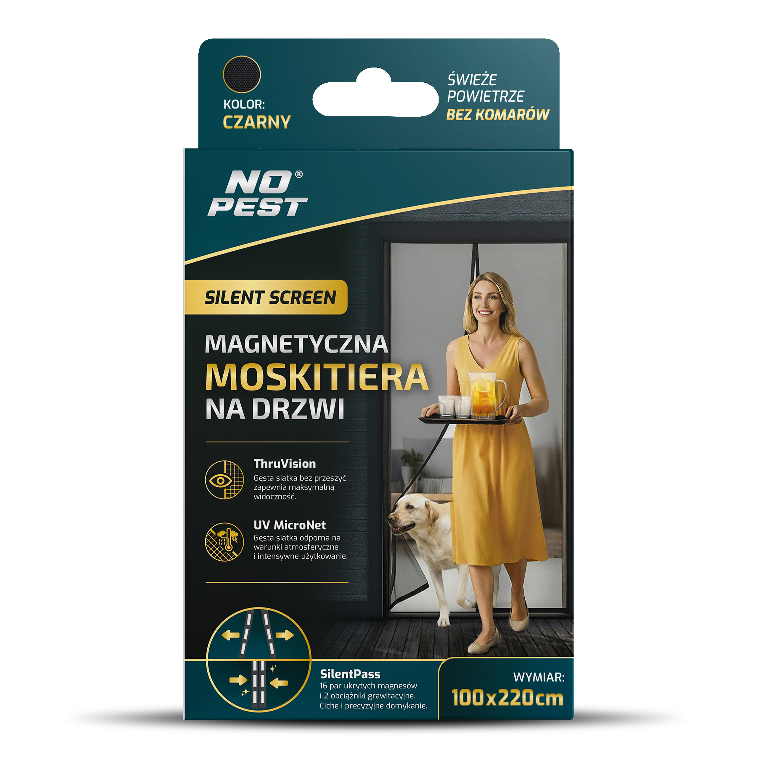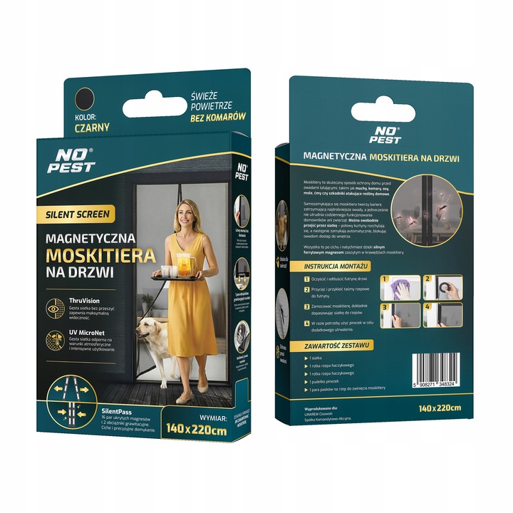Czarna moskitiera magnetyczna samozamykająca się do drzwi balkonowych No Pest® Silent Screen przeznaczona jest do montażu na drzwi balkonowe i tarasowe o maksymalnych wymiarach 100x220 cm. Dwuskrzydłowa konstrukcja z wszytymi magnesami i dodatkowymi obciążnikami umożliwia swobodne przechodzenie przy jednoczesnym ograniczeniu przedostawania się owadów do wnętrza.