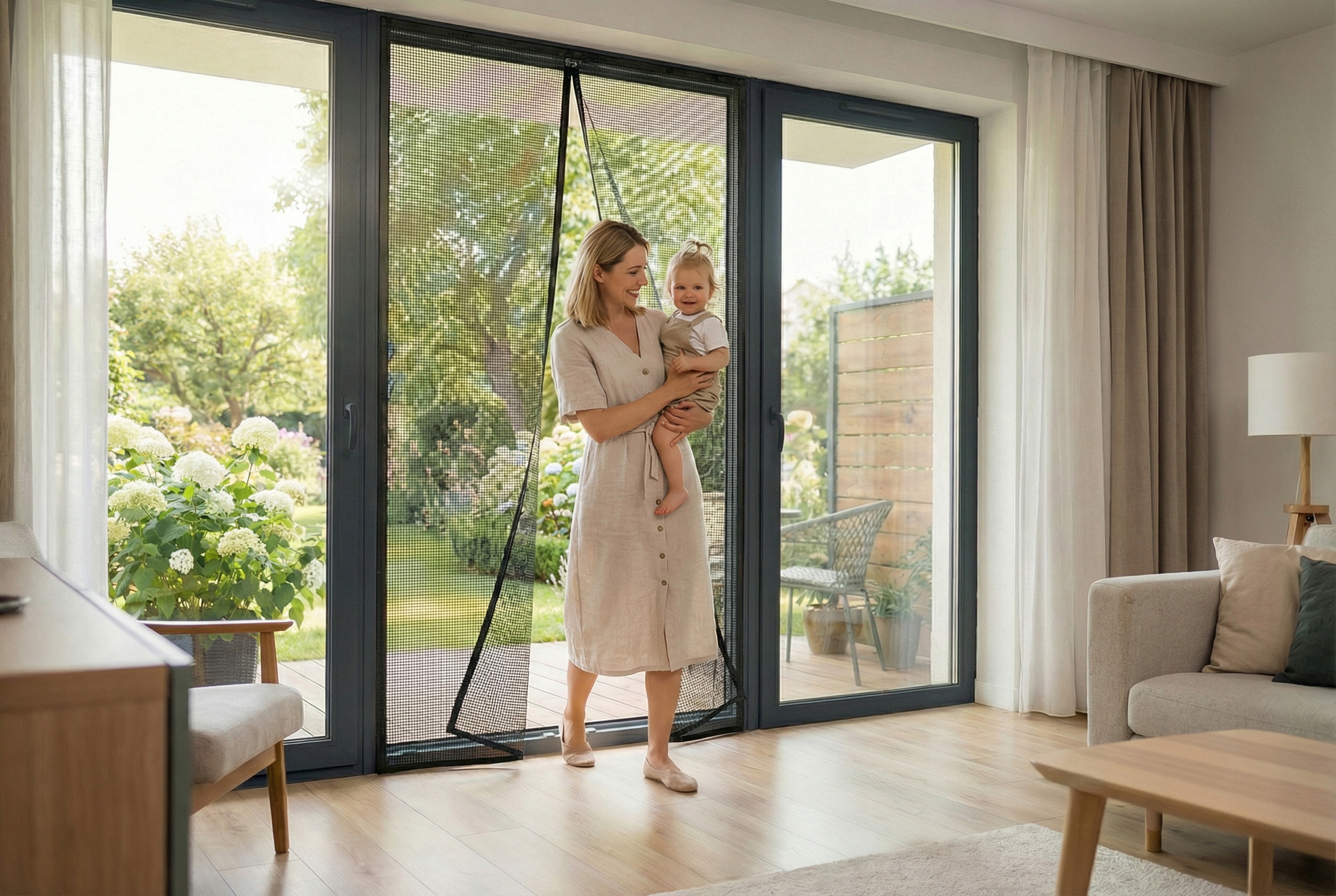 ✔️ Swoboda przejścia – dwuskrzydłowa konstrukcja pozwala przechodzić bez odsuwania, zapinania lub podtrzymywania siatki.