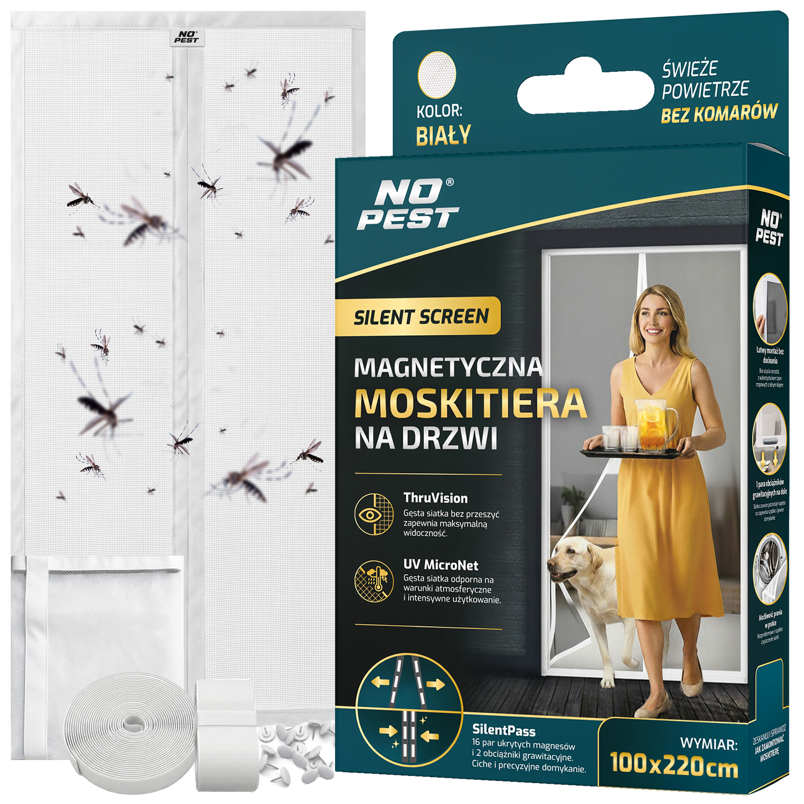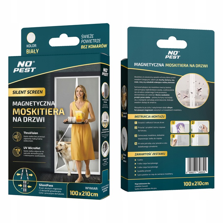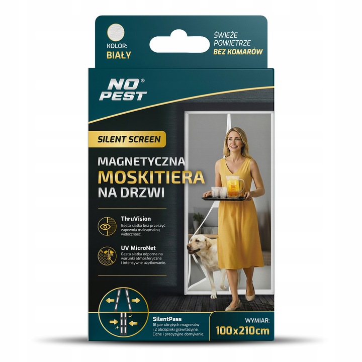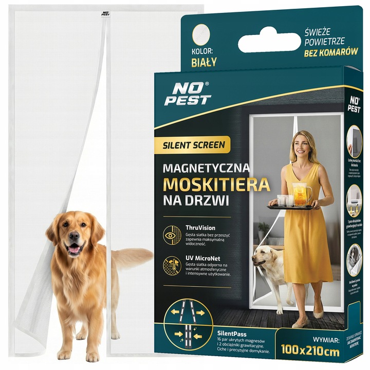 Biała moskitiera magnetyczna samozamykająca się do drzwi balkonowych No Pest® Silent Screen przeznaczona jest do montażu na drzwi balkonowe i tarasowe o maksymalnych wymiarach 100x220 cm. Dwuskrzydłowa konstrukcja z wszytymi magnesami i dodatkowymi obciążnikami umożliwia swobodne przechodzenie przy jednoczesnym ograniczeniu przedostawania się owadów do wnętrza.