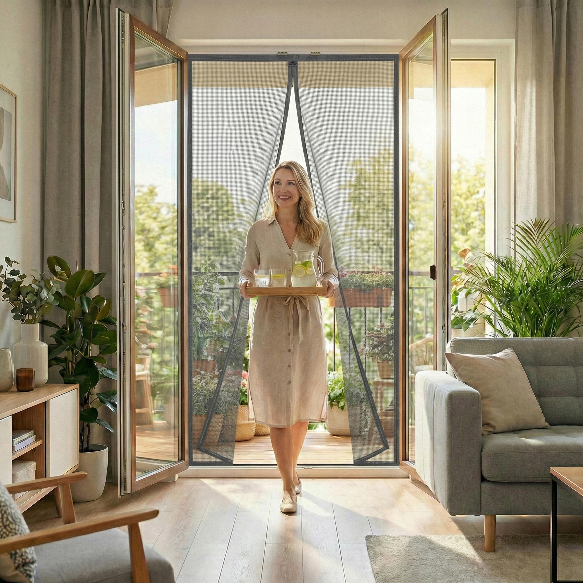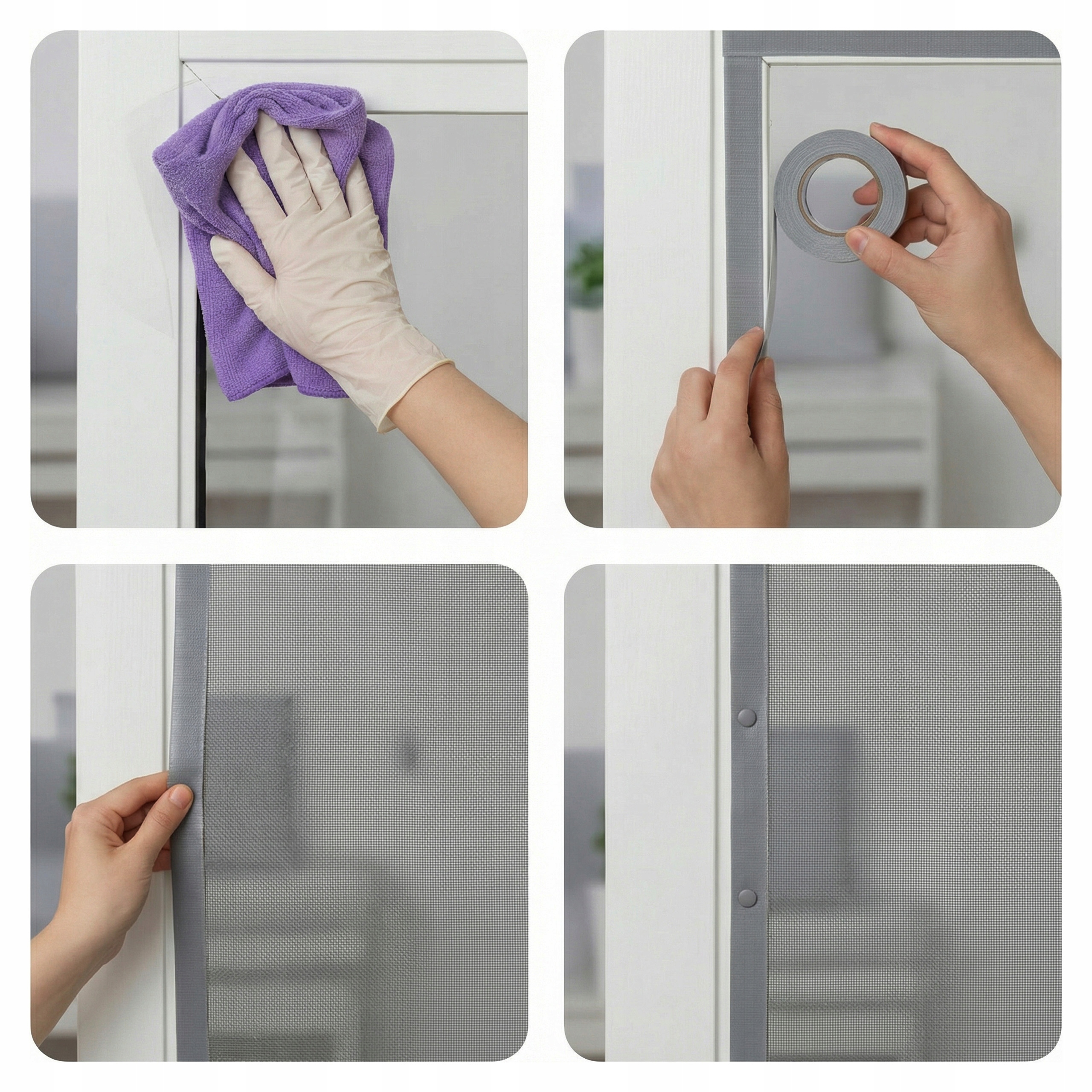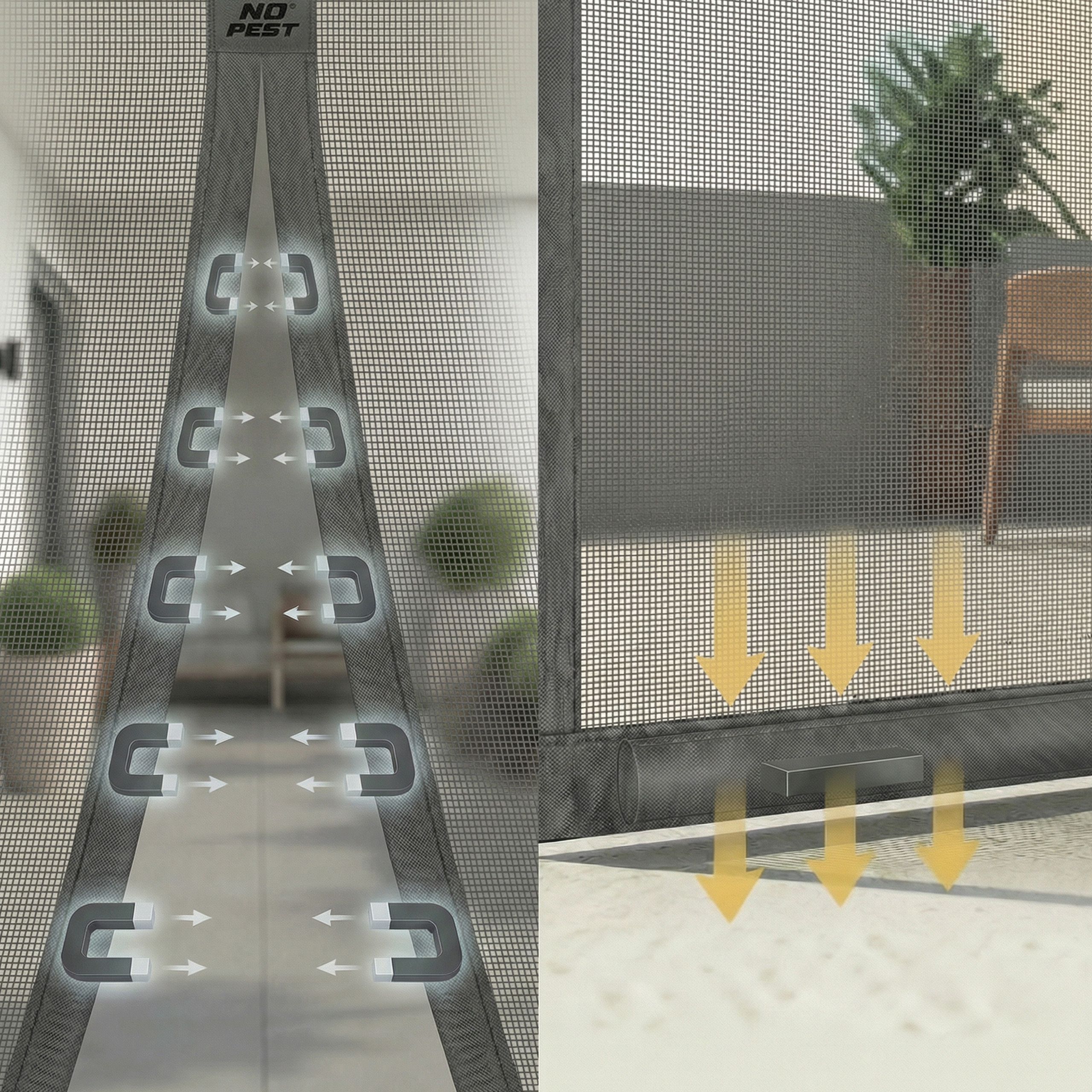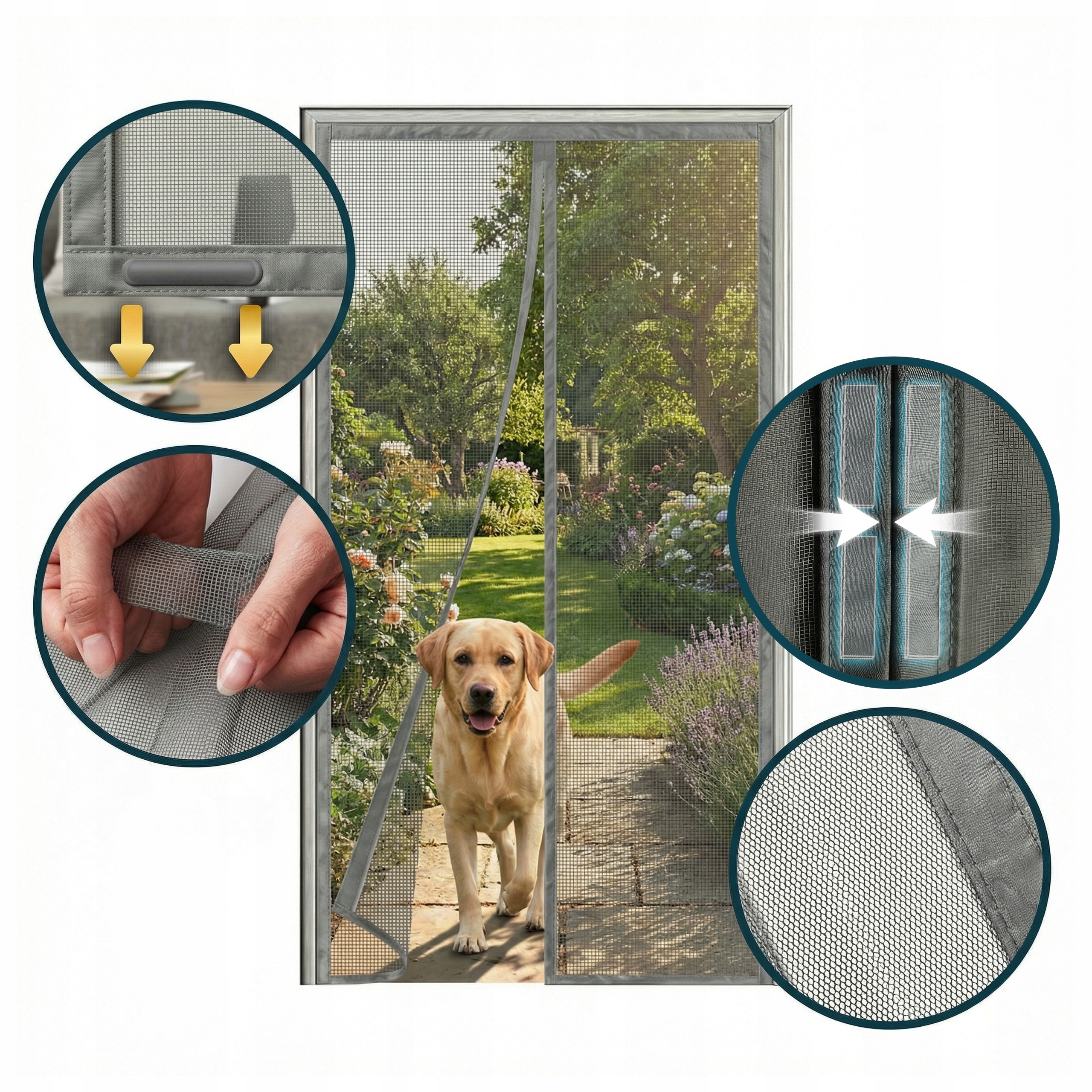 Produkt został wykonany z gęstej, przezroczystej siatki, która nie ogranicza widoczności i dopływu światła. Oprócz designu zyskujesz pełną funkcjonalność: system magnesów i obciążników automatycznie zamyka bezszelestnie przejście za Tobą, a montaż na rzepy (bez wiercenia!) chroni Twoje nowoczesne futryny przed uszkodzeniem. To ochrona w stylu premium.