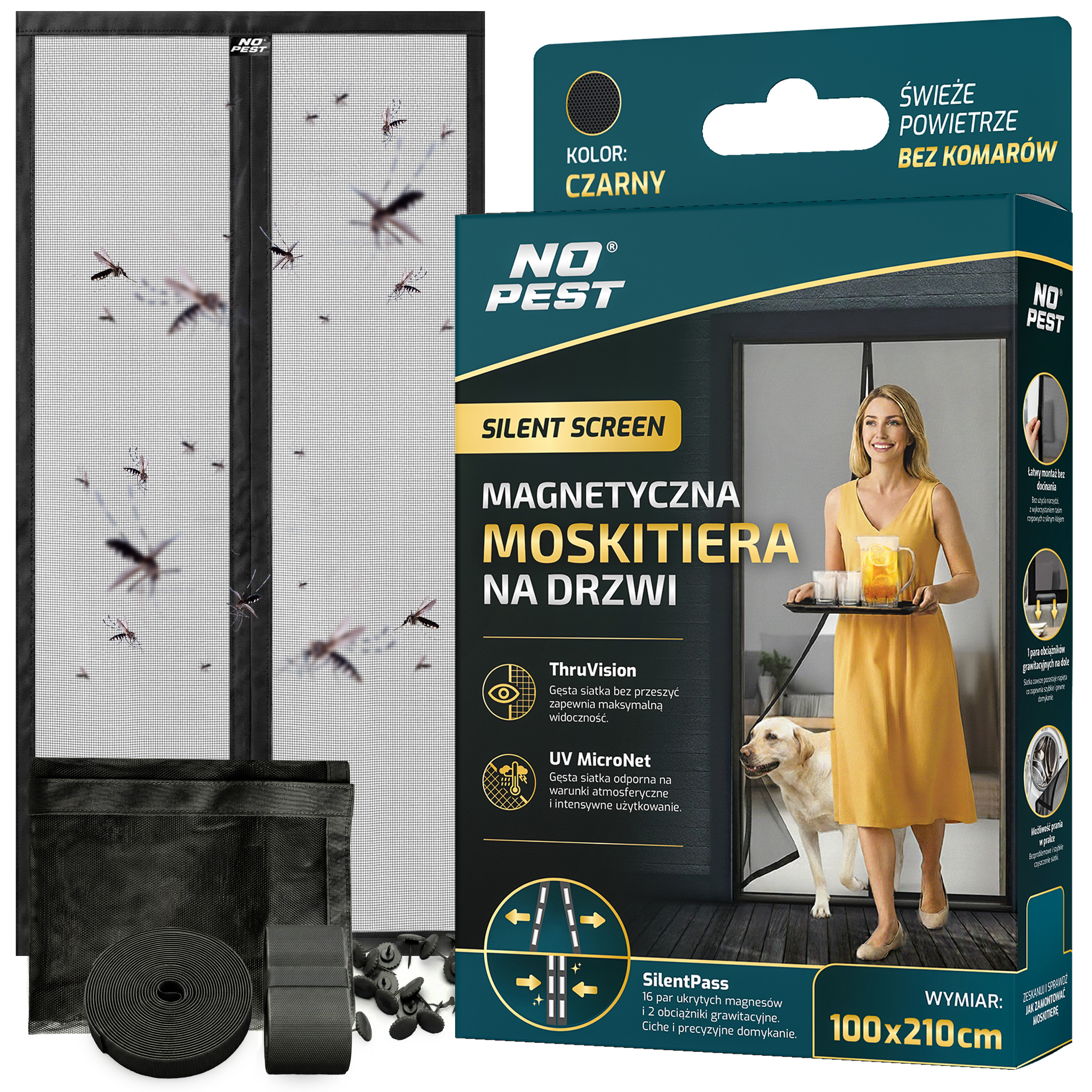 Czarna moskitiera magnetyczna samozamykająca się do drzwi balkonowych No Pest® Silent Screen przeznaczona jest do montażu na drzwi balkonowe i tarasowe o maksymalnych wymiarach 100x210 cm. Dwuskrzydłowa konstrukcja z wszytymi magnesami i dodatkowymi obciążnikami umożliwia swobodne przechodzenie przy jednoczesnym ograniczeniu przedostawania się owadów do wnętrza.