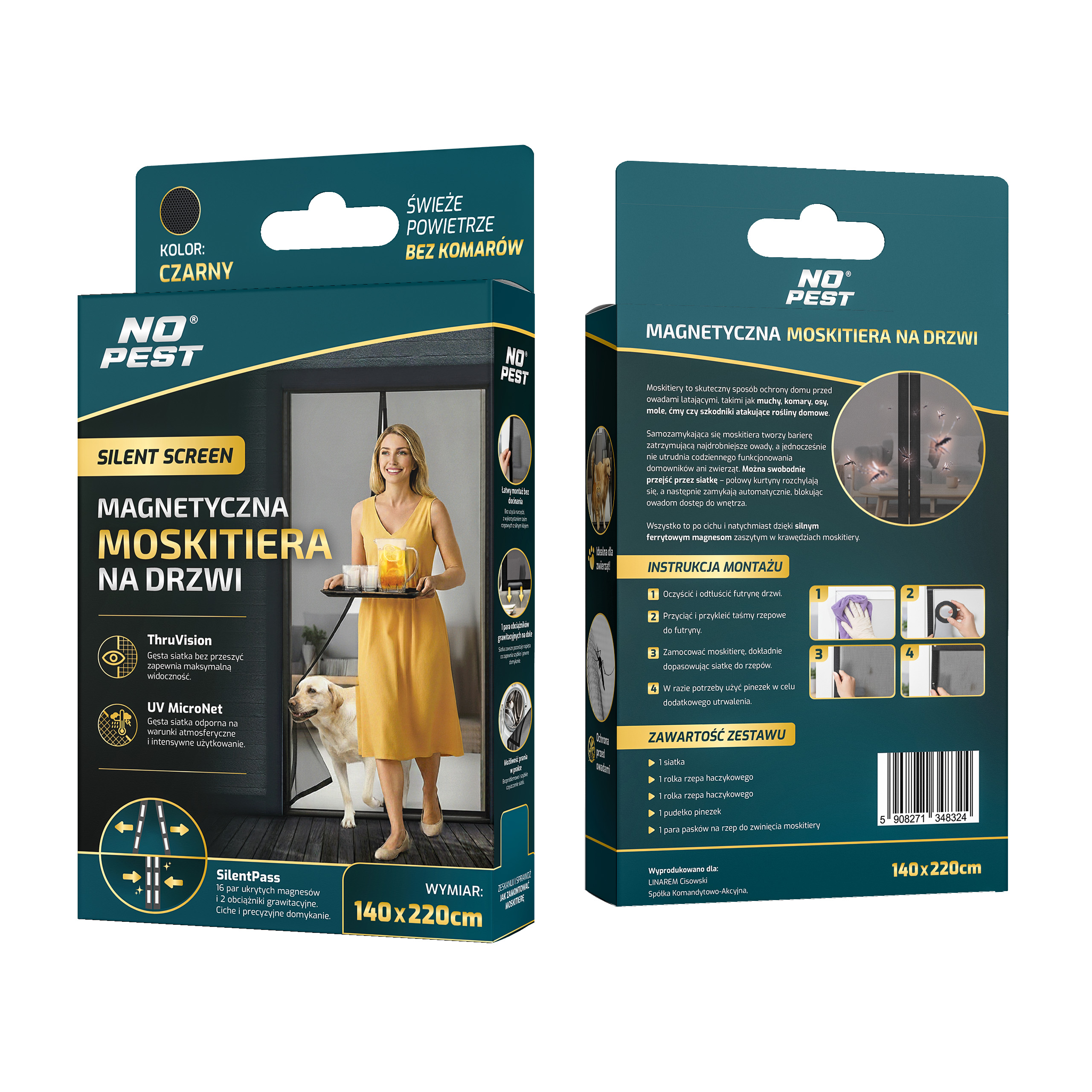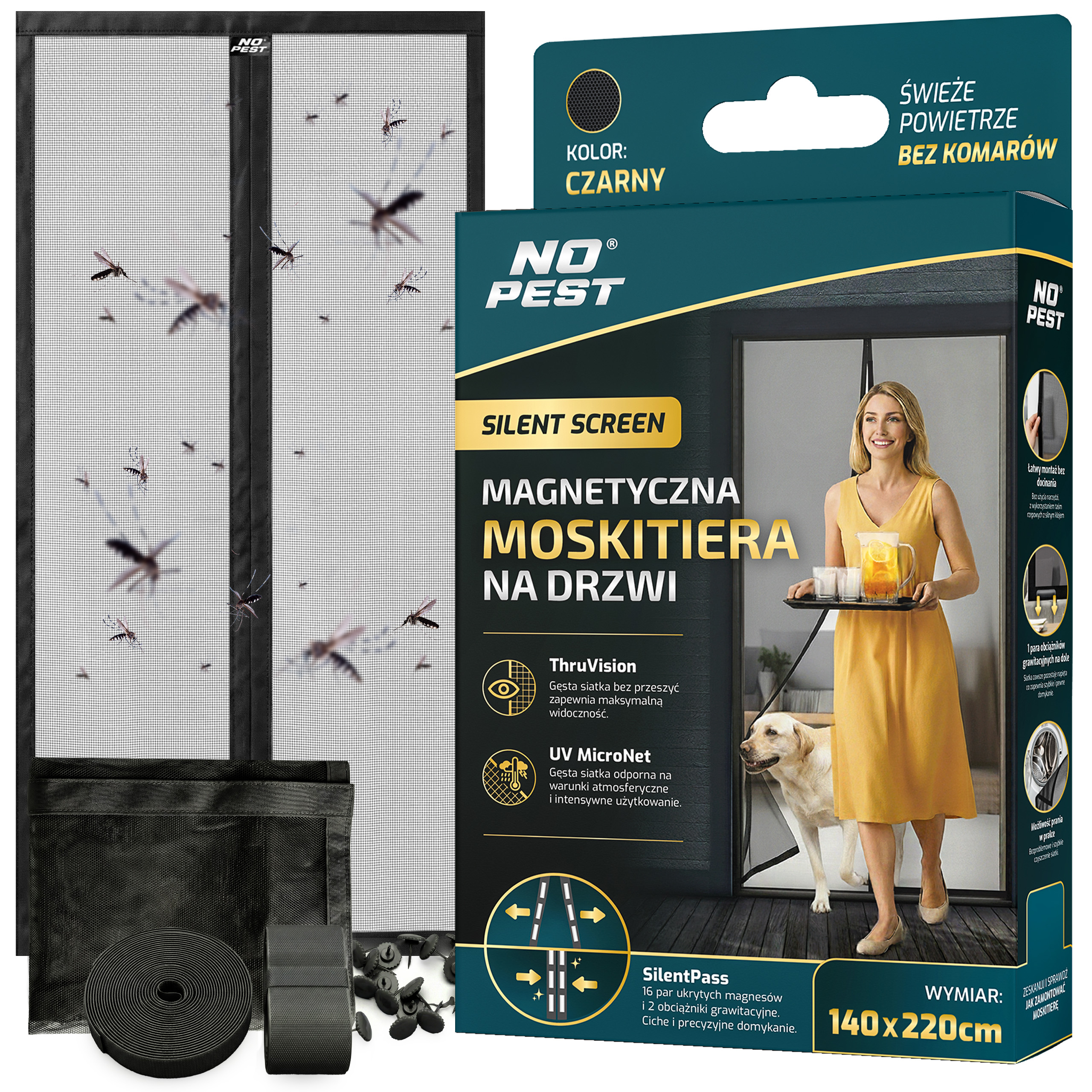Czarna moskitiera magnetyczna samozamykająca się do drzwi balkonowych No Pest® Silent Screen przeznaczona jest do montażu na drzwi balkonowe i tarasowe o maksymalnych wymiarach 140x220 cm. Dwuskrzydłowa konstrukcja z wszytymi magnesami i dodatkowymi obciążnikami umożliwia swobodne przechodzenie przy jednoczesnym ograniczeniu przedostawania się owadów do wnętrza.
