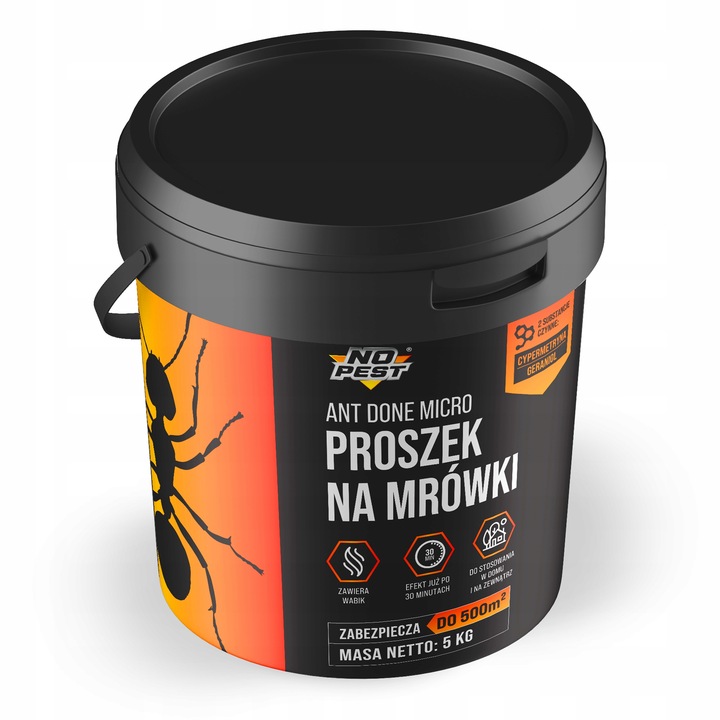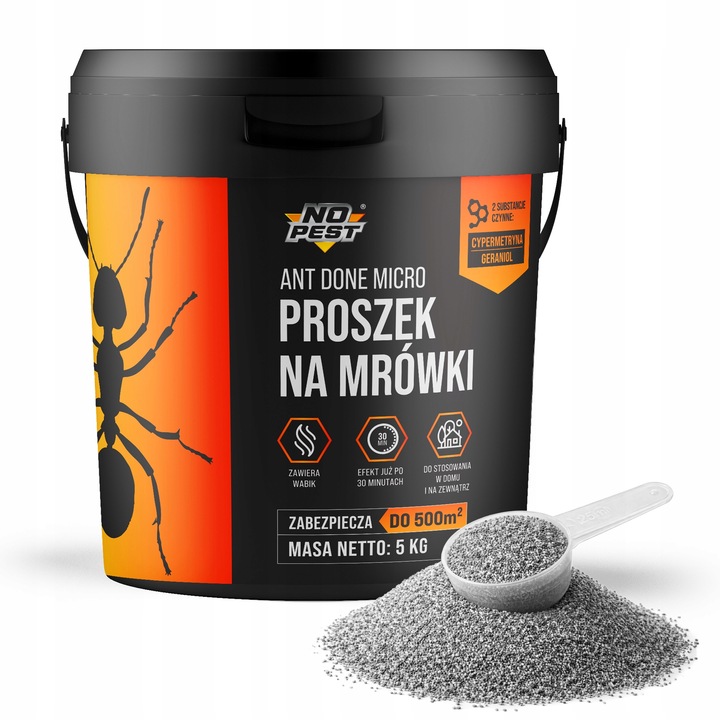 Ant Done Micro No Pest® 5 kg to preparat biobójczy w formie gotowego do użycia granulatu przeznaczony do zwalczania mrówek w obrębie budynków oraz w ich bezpośrednim otoczeniu. Produkt został opracowany z myślą o odpowiednim ograniczaniu populacji mrówek w miejscach ich bytowania i przemieszczania się. Granulowana forma ułatwia precyzyjne rozsypywanie preparatu i równomierne pokrycie powierzchni.