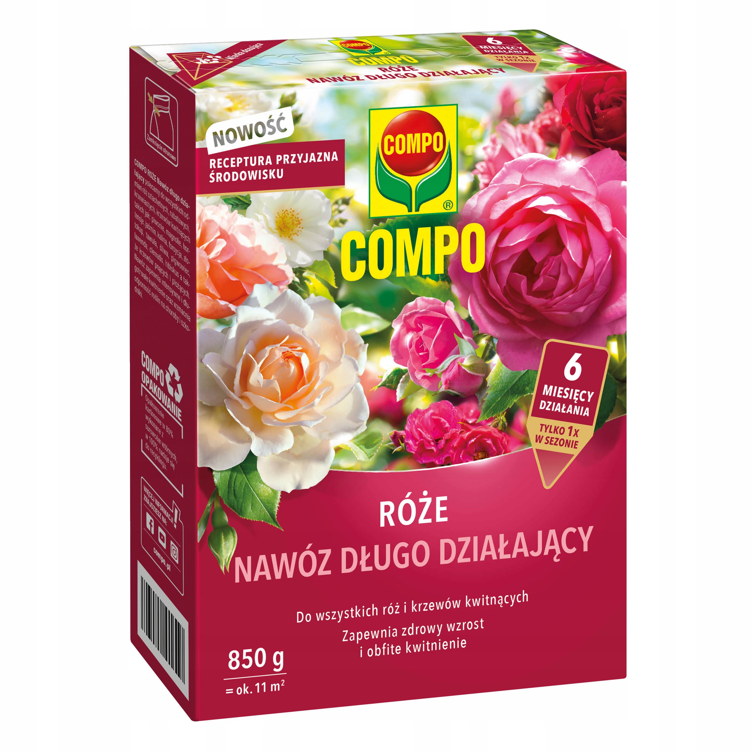 COMPO RÓŻE Nawóz 6 miesięczny to nawóz granulowany przeznaczony do nawożenia róż oraz innych roślin ozdobnych w ogrodzie. Produkt stosowany jest w przydomowych ogrodach i na działkach jako element pielęgnacji roślin ozdobnych. COMPO RÓŻE Nawóz 6 miesięczny zawiera składniki odżywcze wykorzystywane przez rośliny w okresie wzrostu. Formuła nawozu została opracowana z myślą o stopniowym uwalnianiu składników pokarmowych w glebie. Nawóz może być stosowany podczas sadzenia oraz w trakcie sezonu wegetacyjnego. Granulowana forma ułatwia równomierne rozprowadzenie produktu w glebie oraz jego zastosowanie w pobliżu roślin.