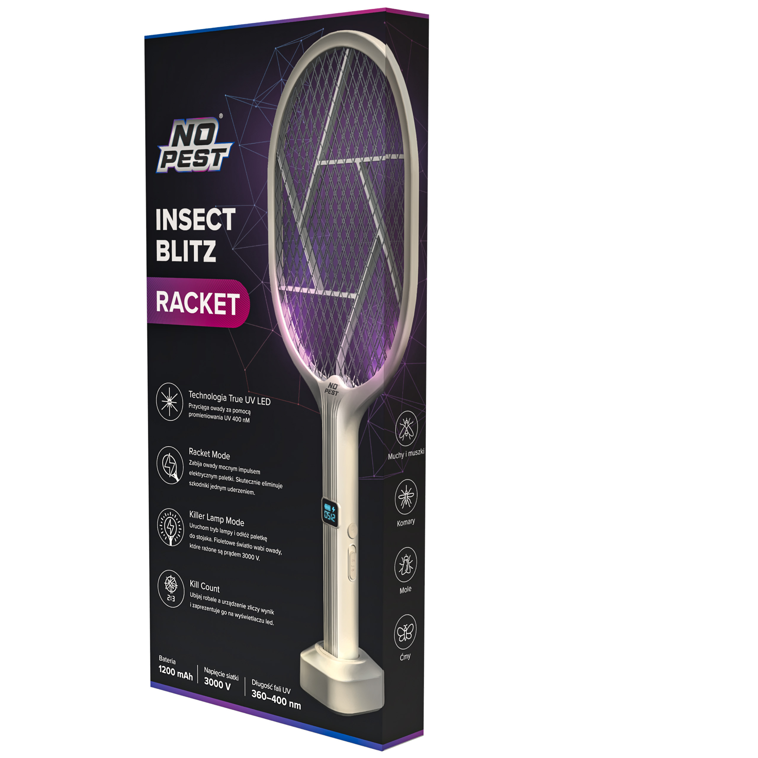 Elektryczna łapka Insect Blitz Racket No Pest® to urządzenie przeznaczone do mechanicznego eliminowania much, komarów, moli, ćem i innych owadów latających w pomieszczeniach oraz w otoczeniu budynków.