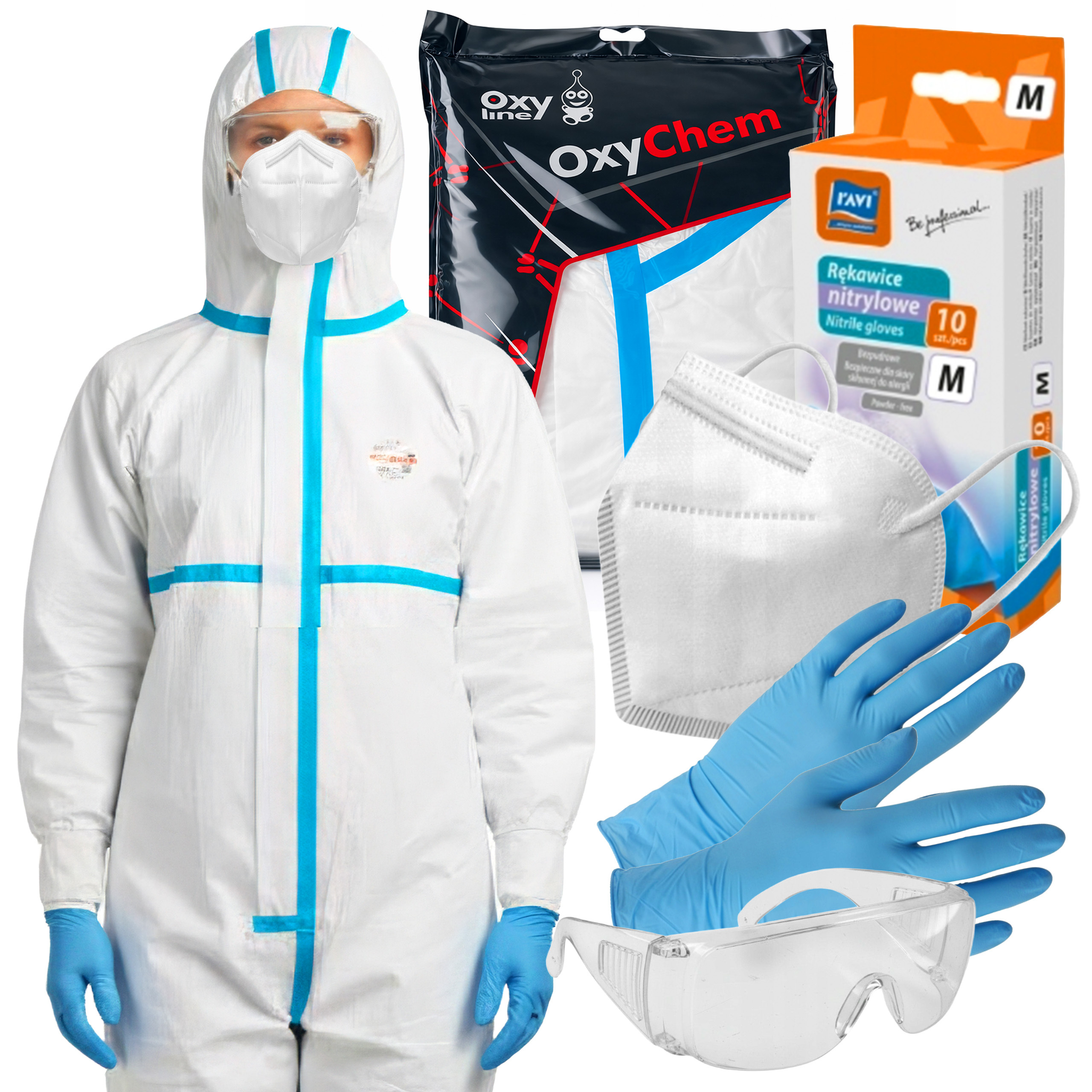 Każdy element zestawu pełni inną funkcję w zakresie wyposażenia roboczego. Maska filtrująca ogranicza narażenie na cząstki unoszące się w powietrzu, rękawice ułatwiają chwyt narzędzi i elementów roboczych, okulary ograniczają ryzyko kontaktu oczu z odpryskami materiałów, a kombinezon oddziela odzież użytkownika od pyłów oraz zabrudzeń powstających podczas pracy.