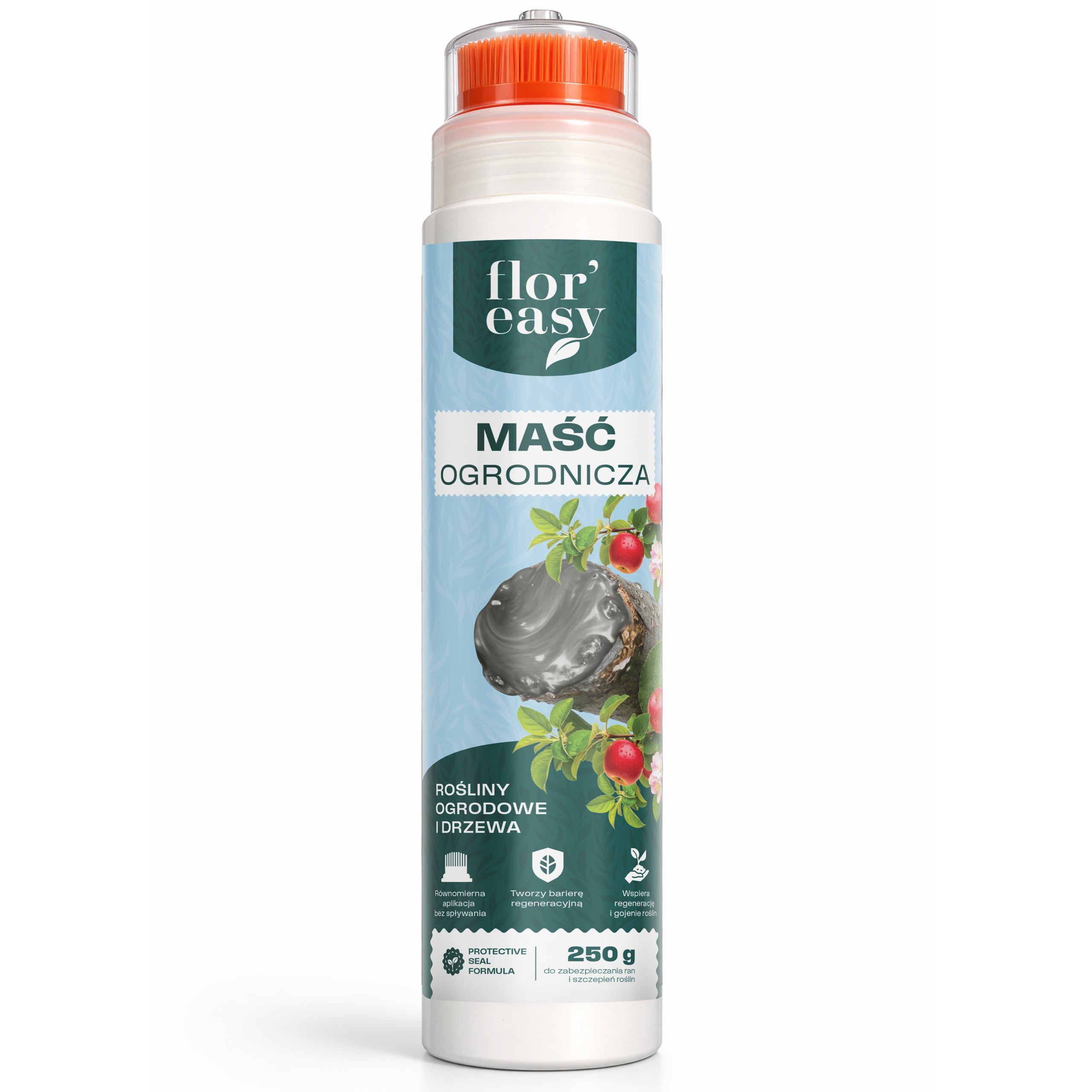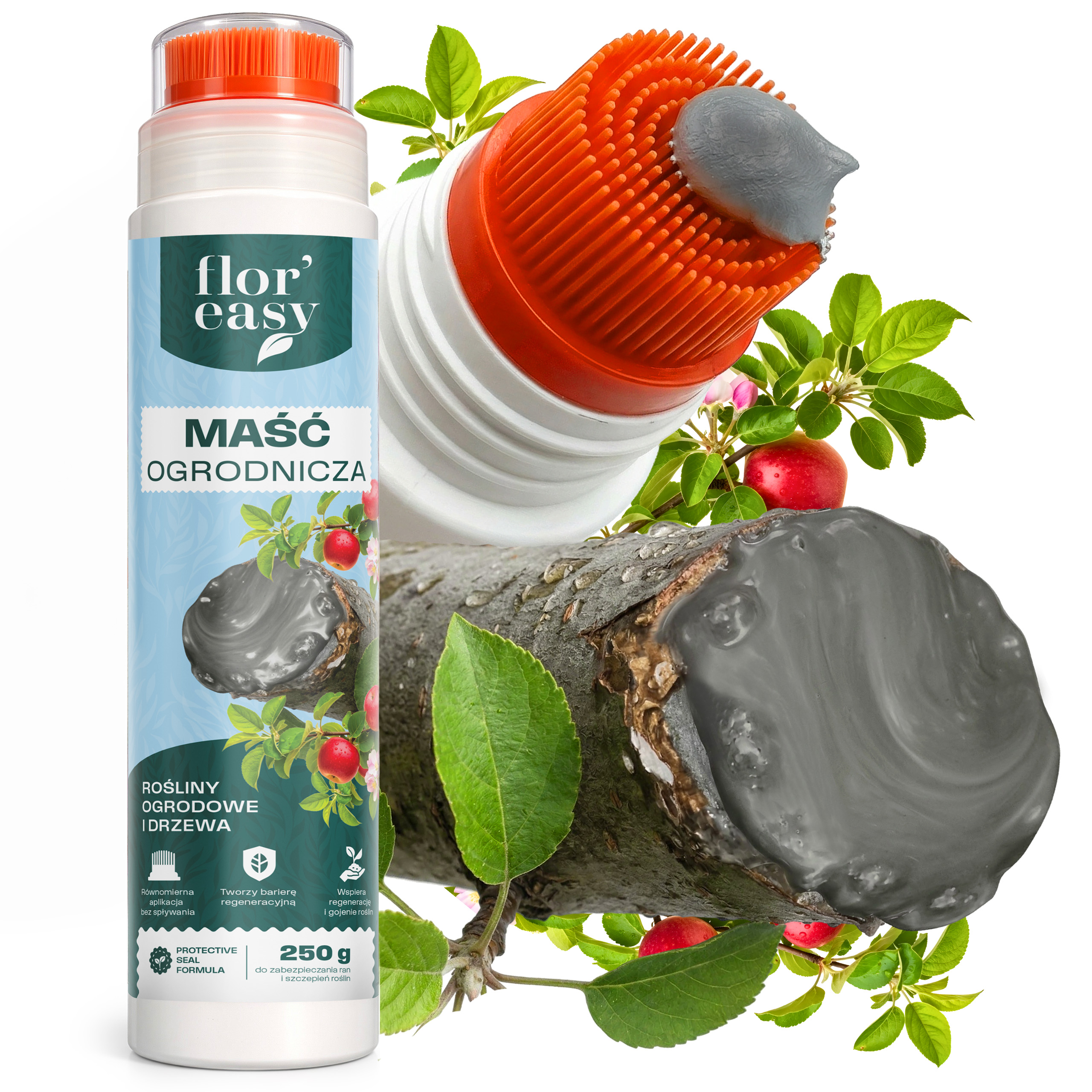 Maść ogrodnicza Flor’easy to preparat przeznaczony do stosowania na rany powstałe podczas cięcia, przycinania oraz szczepienia roślin. Tworzy na powierzchni warstwę, która ogranicza kontakt miejsca uszkodzenia z czynnikami zewnętrznymi, takimi jak wilgoć czy opady.