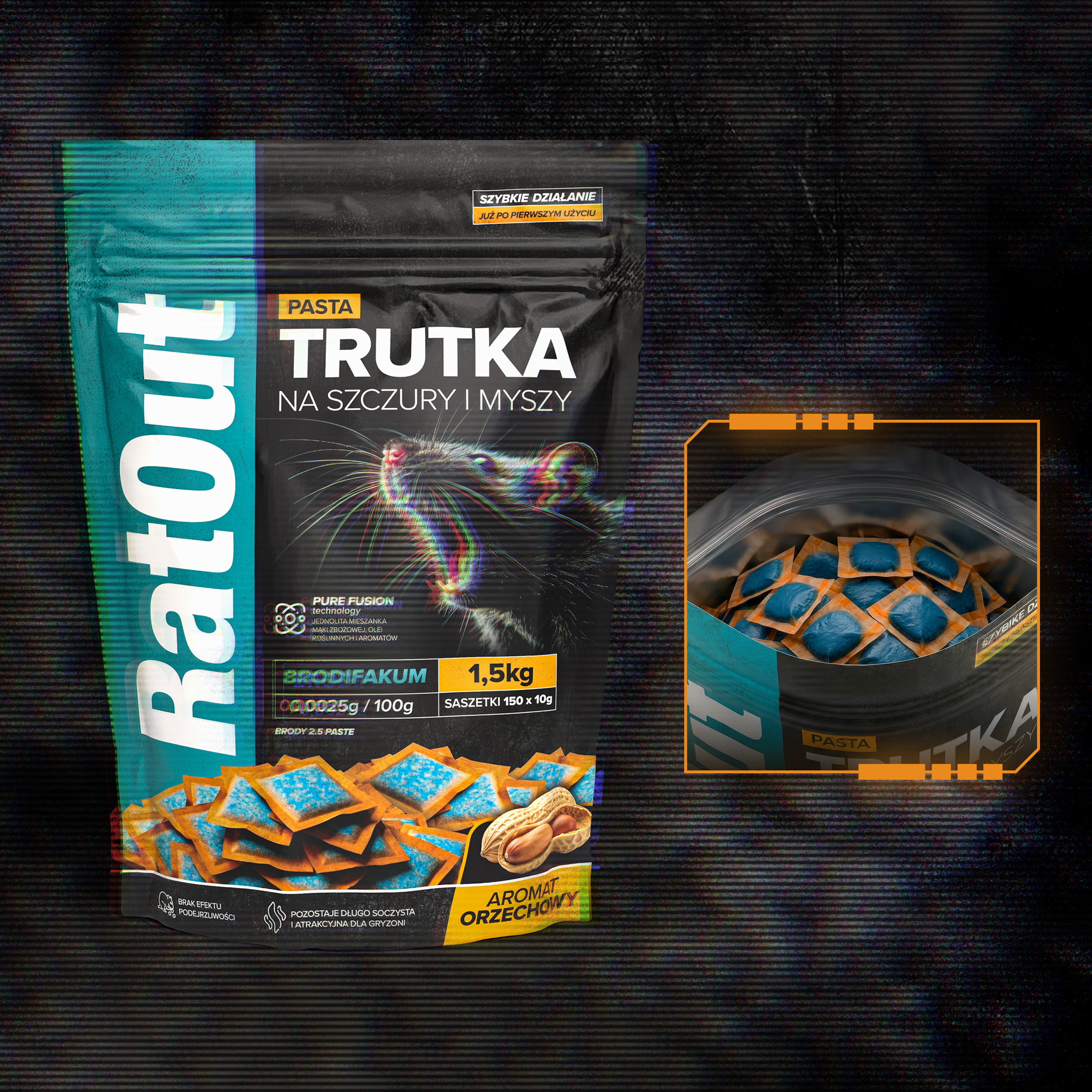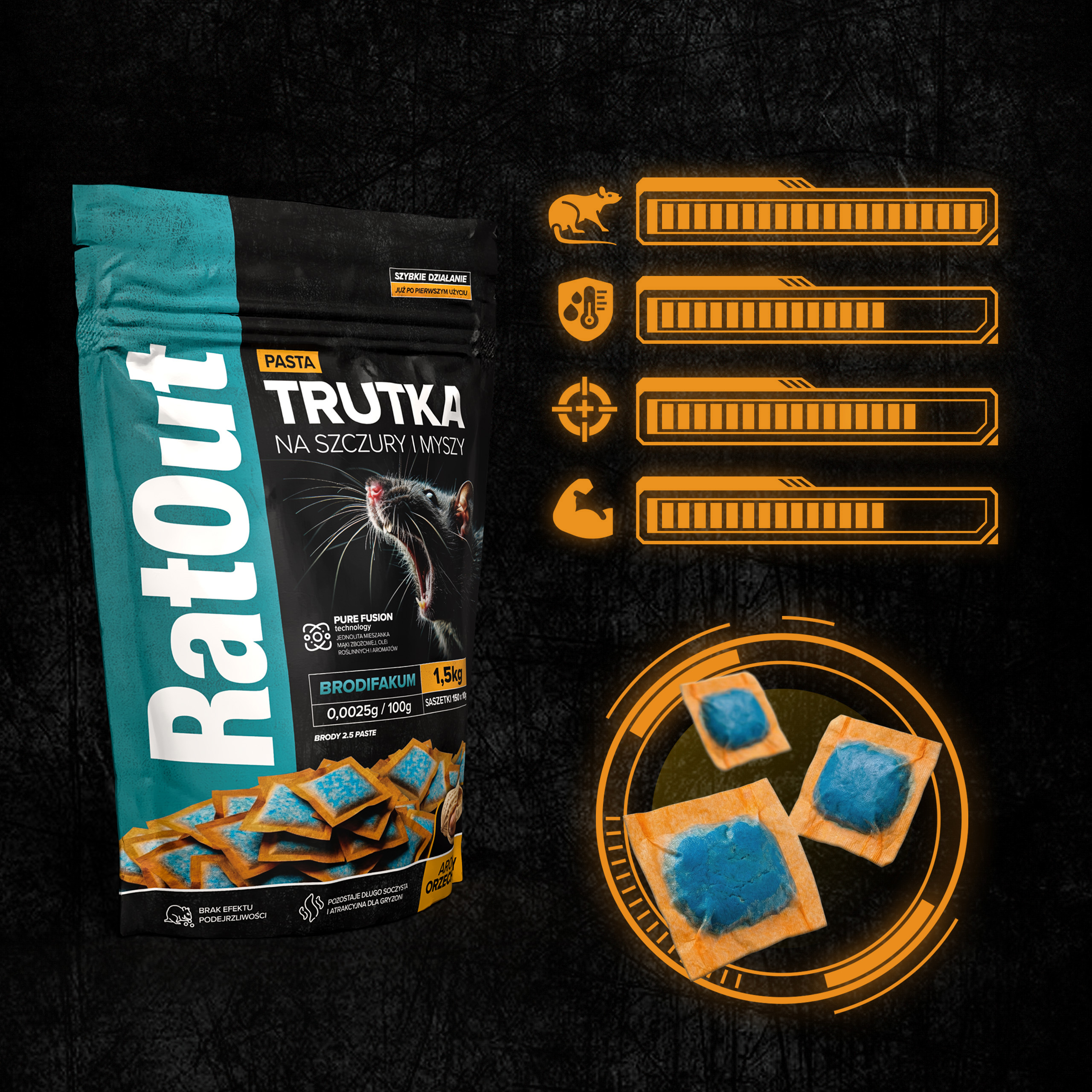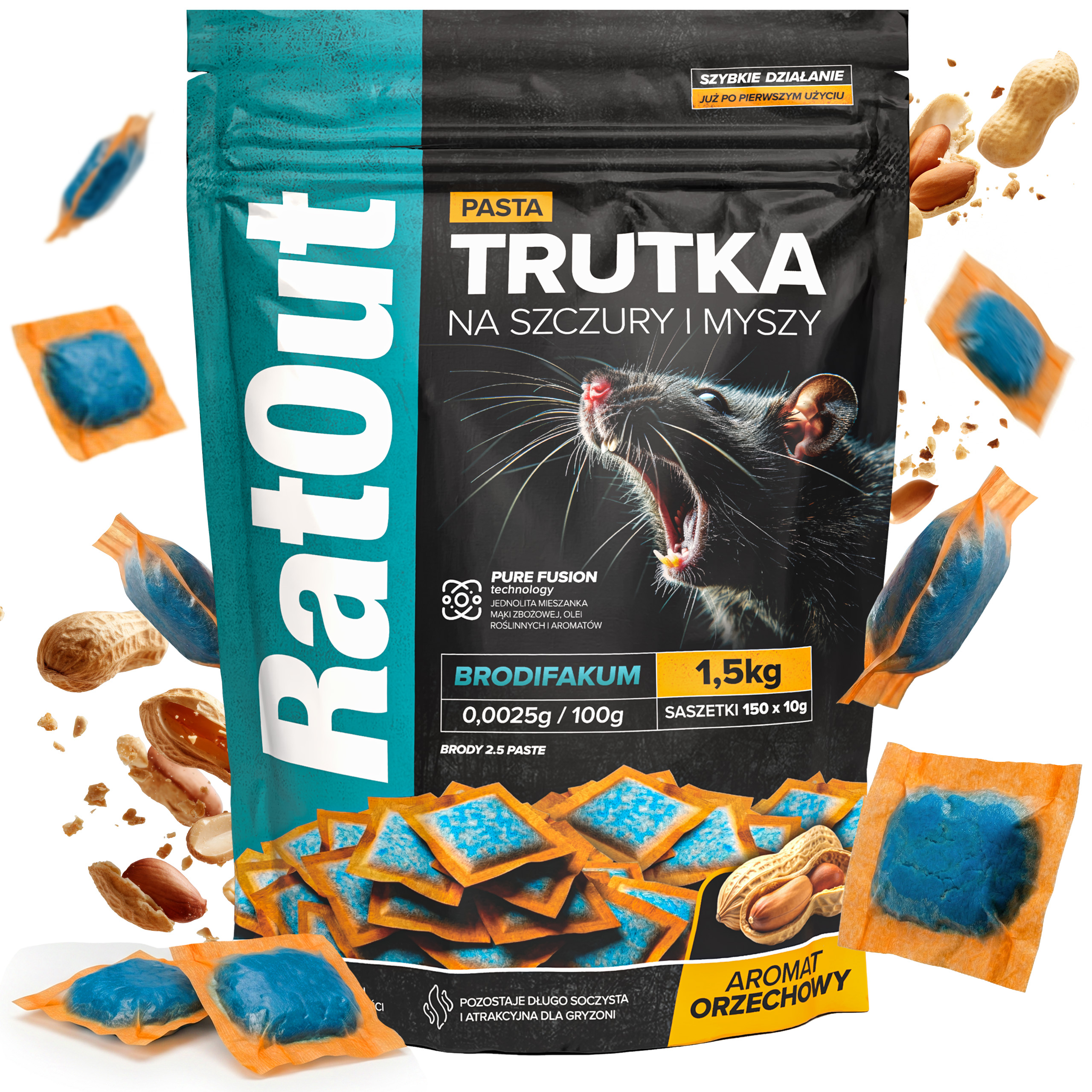 Pasta orzechowa RatOut® to profesjonalna trutka na szczury i myszy oparta na brodifakum (0,0025 g/100 g). Pasta w saszetkach brodifakum od RatOut® została zaprojektowana jako przynęta o wysokiej skuteczności w zwalczaniu gryzoni w codziennych warunkach użytkowania, gdzie decydujące znaczenie ma szybkie pobranie i brak wzbudzania podejrzeń. Dzięki technologii Pure Fusion pasta w saszetkach posiada miękką, wilgotną konsystencję, która w połączeniu z intensywnym aromatem orzechowym, jest bezbłędnie lokalizowana i chętnie pobierana przez gryzonie w warunkach bez dostępu do wody, gdzie szczury chętnie sięgają po mokre pokarmy.