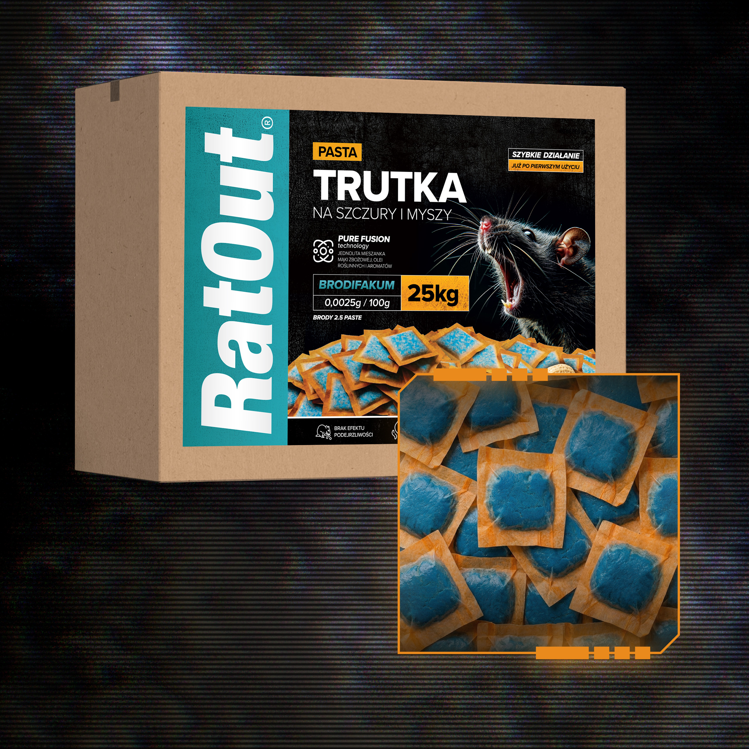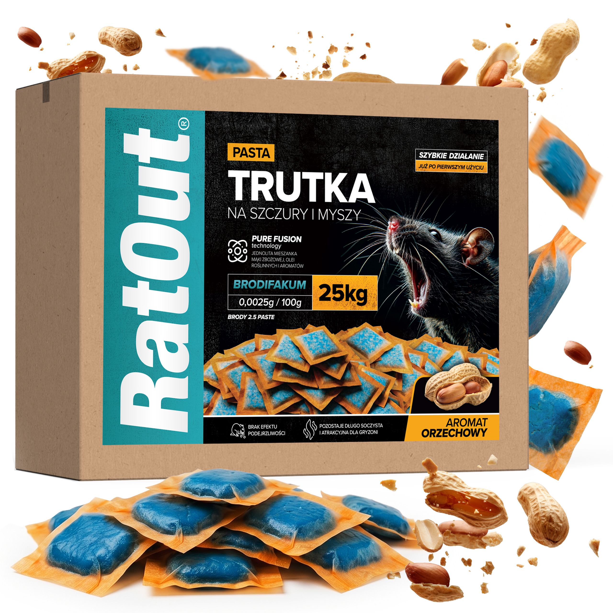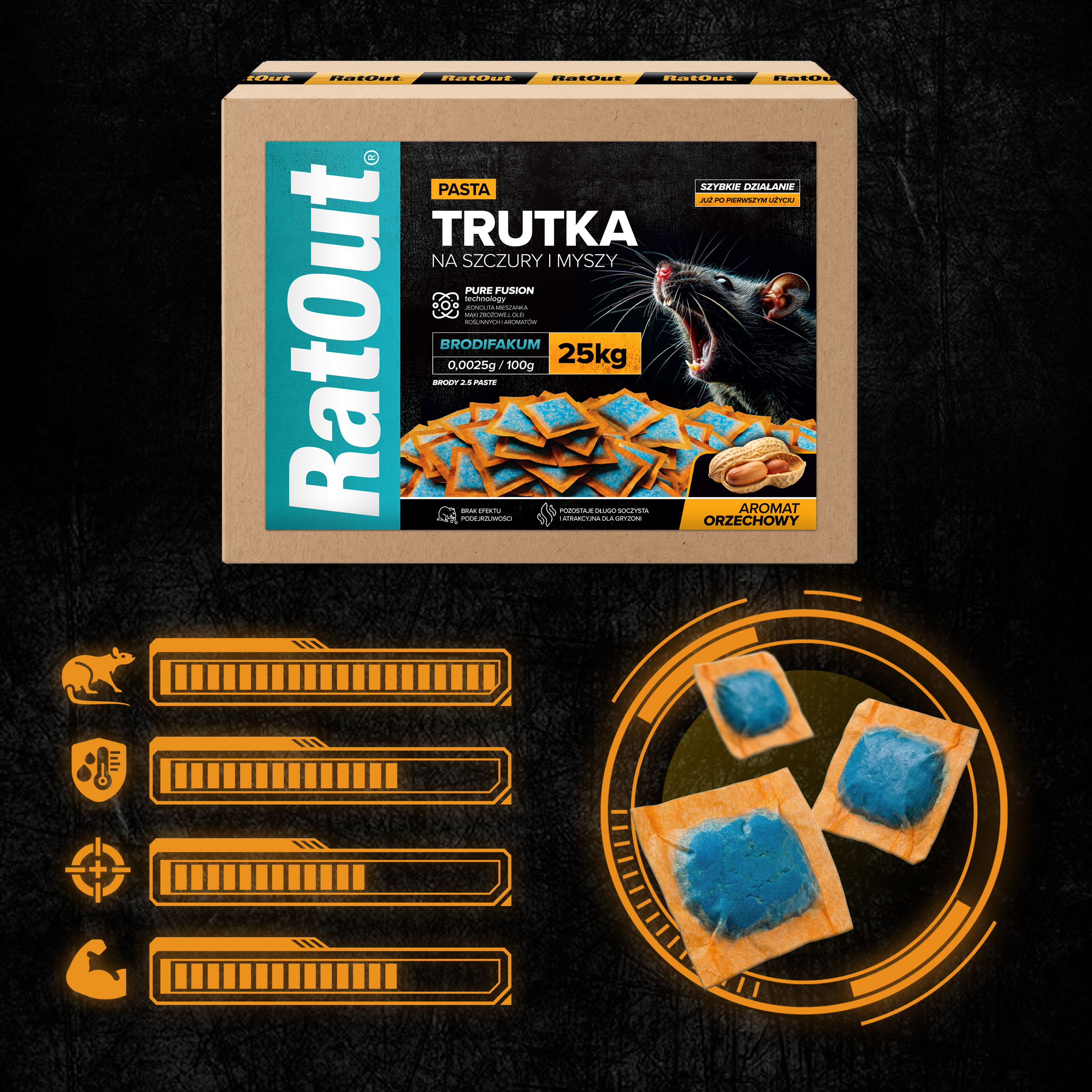 Pasta orzechowa RatOut® to profesjonalna trutka na szczury i myszy oparta na brodifakum (0,0025 g/100 g). Pasta w saszetkach brodifakum od RatOut® została zaprojektowana jako przynęta o wysokiej skuteczności w zwalczaniu gryzoni w codziennych warunkach użytkowania, gdzie decydujące znaczenie ma szybkie pobranie i brak wzbudzania podejrzeń. Dzięki technologii Pure Fusion pasta w saszetkach posiada miękką, wilgotną konsystencję, która w połączeniu z intensywnym aromatem orzechowym, jest bezbłędnie lokalizowana i chętnie pobierana przez gryzonie w warunkach bez dostępu do wody, gdzie szczury chętnie sięgają po mokre pokarmy.