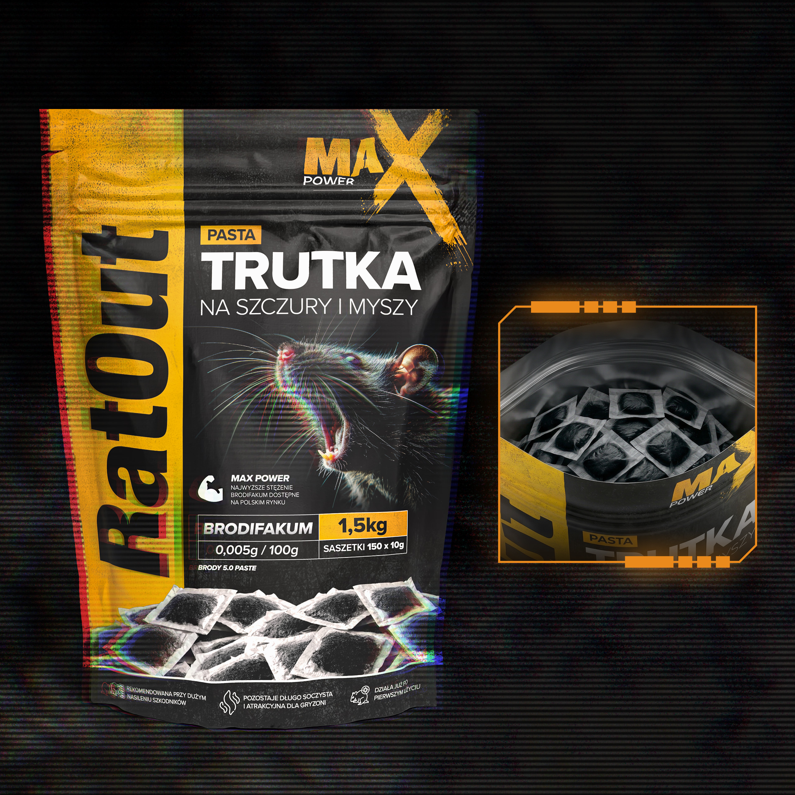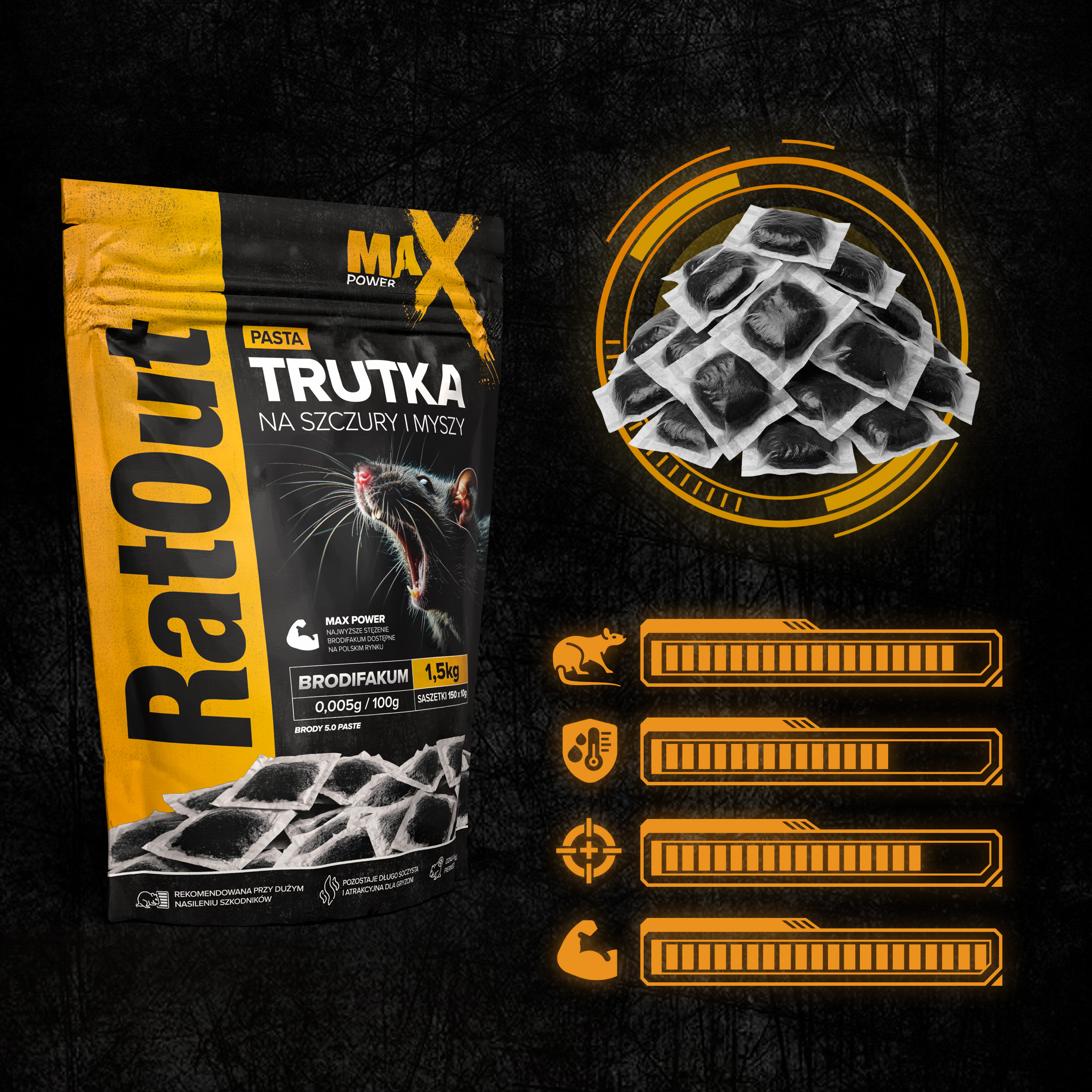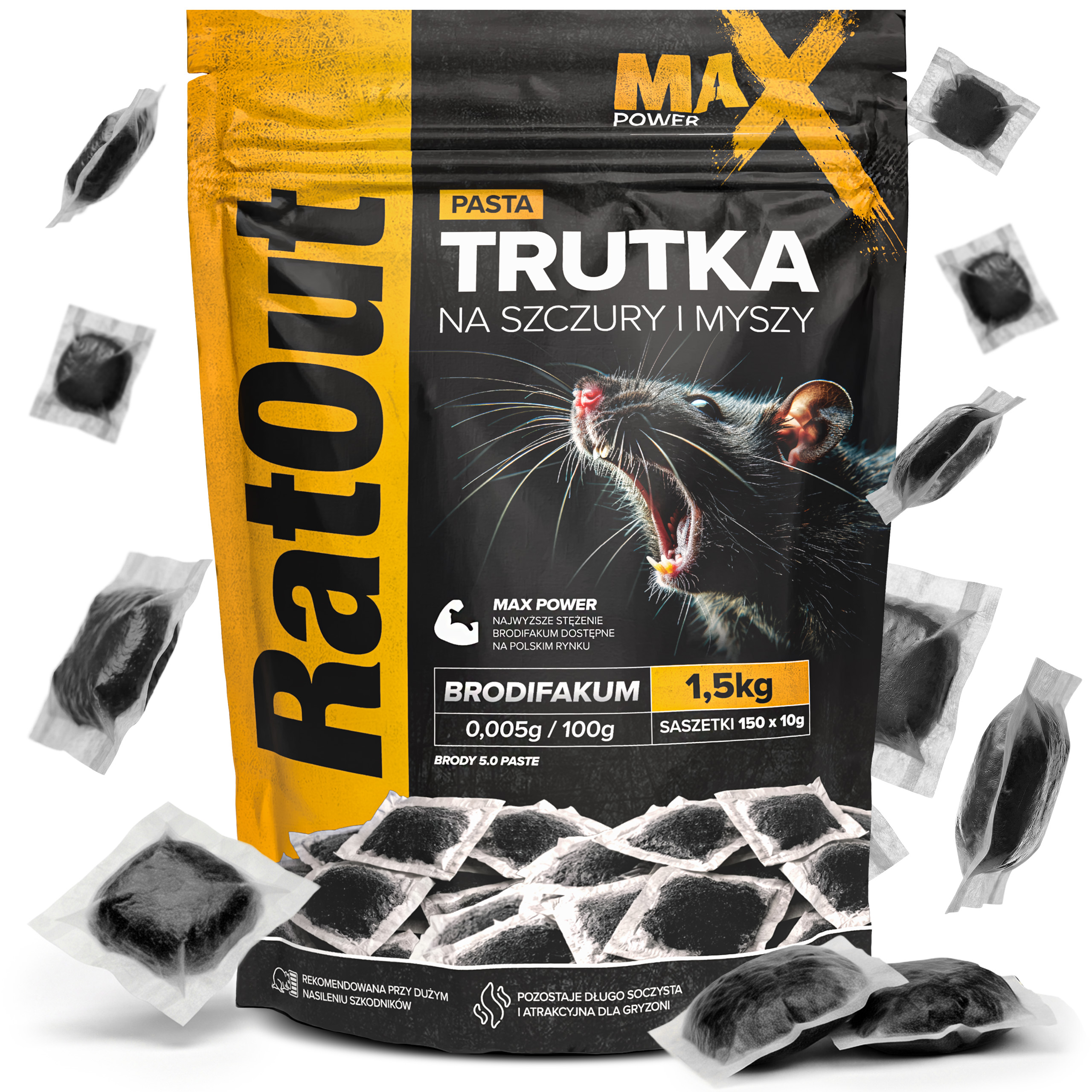 Pasta czarna RatOut® MaX Power to profesjonalna trutka na szczury i myszy oparta na brodifakum (0,005 g/100 g). Pasta w saszetkach brodifakum od RatOut® została zaprojektowana jako przynęta o maksymalnej skuteczności w zwalczaniu gryzoni w codziennych warunkach użytkowania, szczególnie tam, gdzie problem ma dużą skalę i liczy się szybkie pobranie oraz brak wzbudzania podejrzeń. Dzięki technologii MaX Power pasta w saszetkach posiada miękką, wilgotną konsystencję, która w połączeniu z intensywnym aromatem orzechowym jest łatwo lokalizowana i chętnie pobierana przez gryzonie nawet w wymagających warunkach oraz przy dużej presji infestacji.