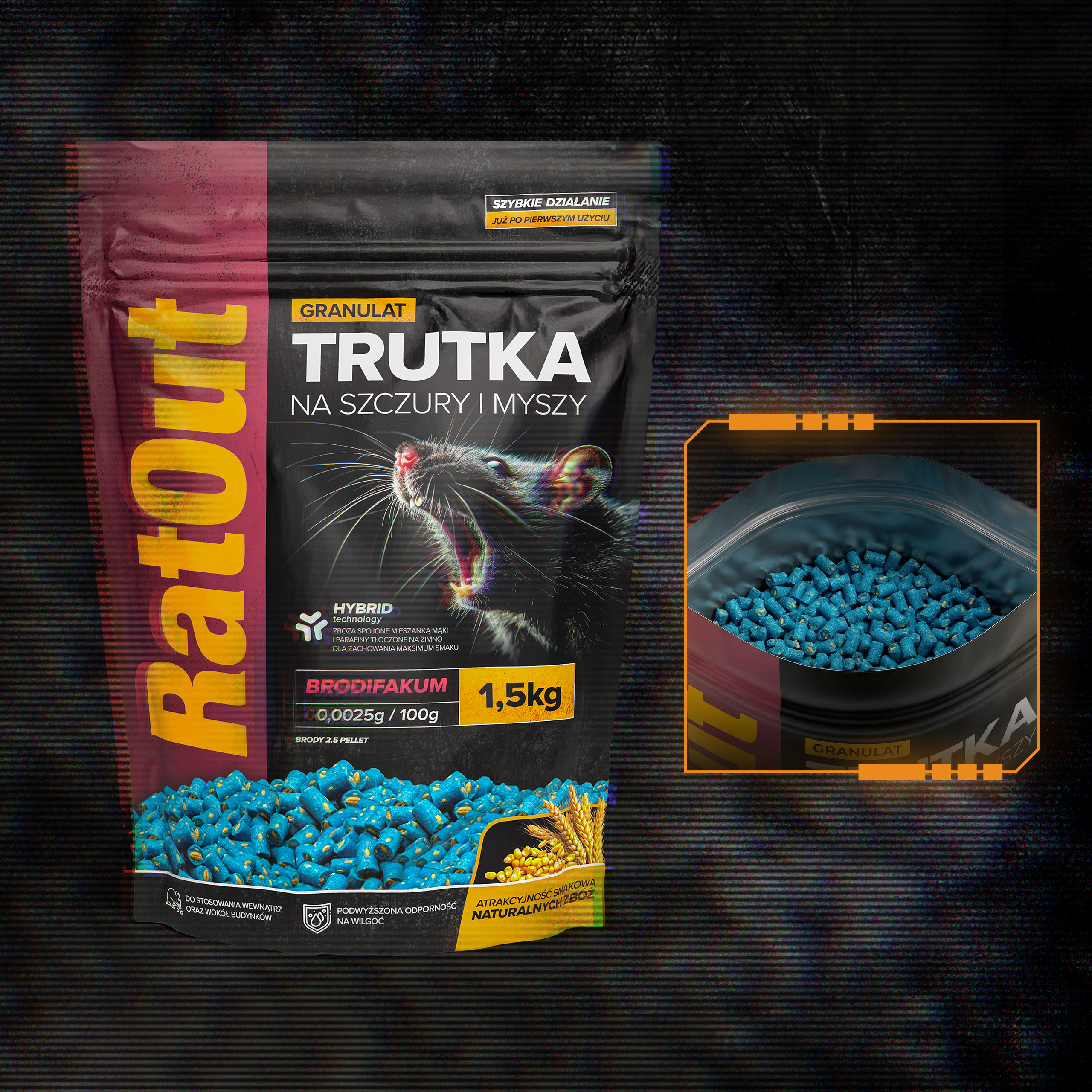 Granulat hybrydowy RatOut® to profesjonalna trutka na szczury i myszy oparta na brodifakum (0,0025 g/100 g). Granulat pellet brodifakum od RatOut® został zaprojektowany jako przynęta o wysokiej skuteczności w zwalczaniu gryzoni w codziennych warunkach użytkowania, szczególnie tam, gdzie liczy się odporność na wilgoć, zmienne warunki atmosferyczne oraz długotrwałe zachowanie właściwości. Dzięki technologii HYBRID granulat pellet łączy smakowitość naturalnych zbóż z trwałością kostki woskowej, dlatego jest chętnie pobierany przez gryzonie i skuteczny nawet w chłodnych piwnicach, wilgotnych składzikach oraz na zewnątrz budynków.