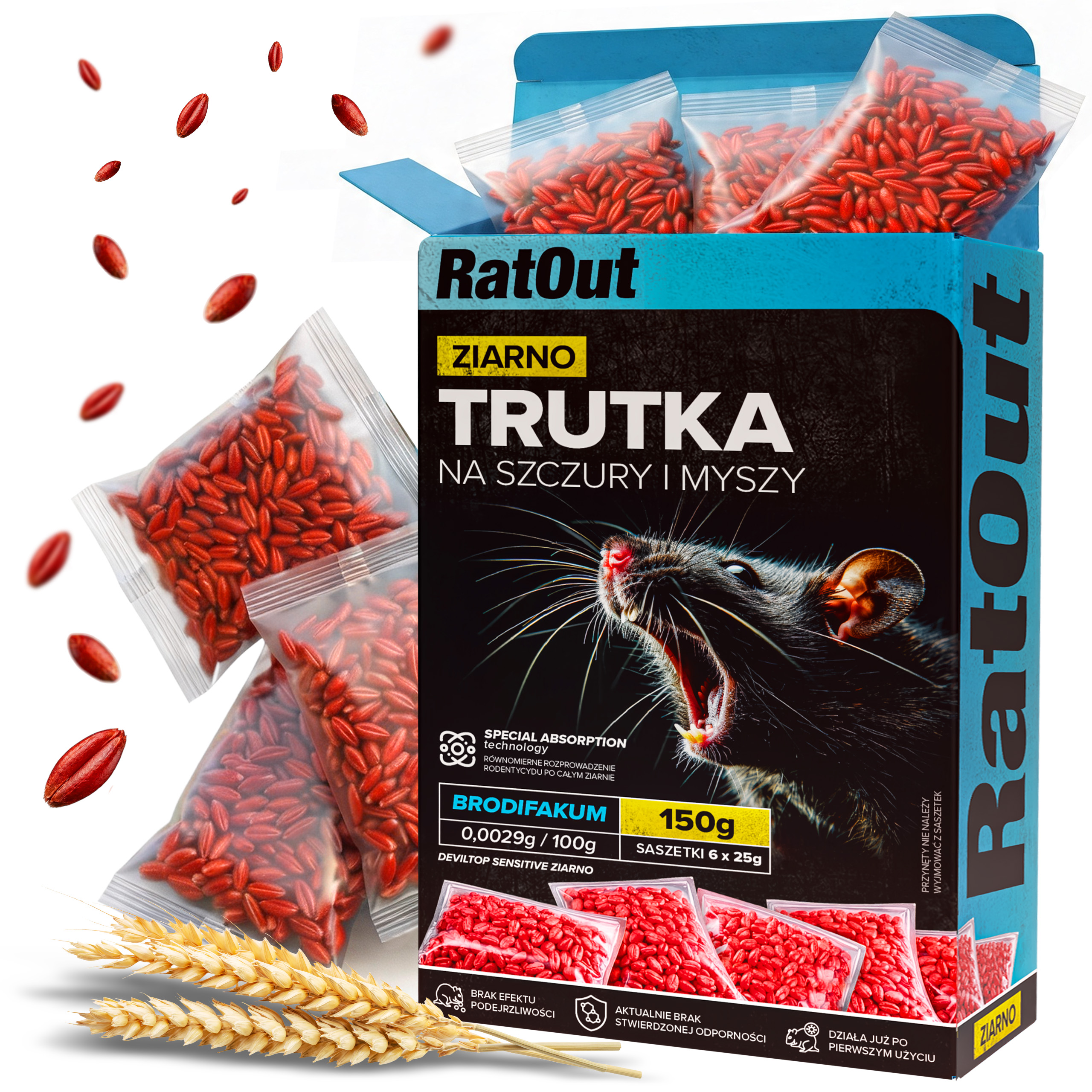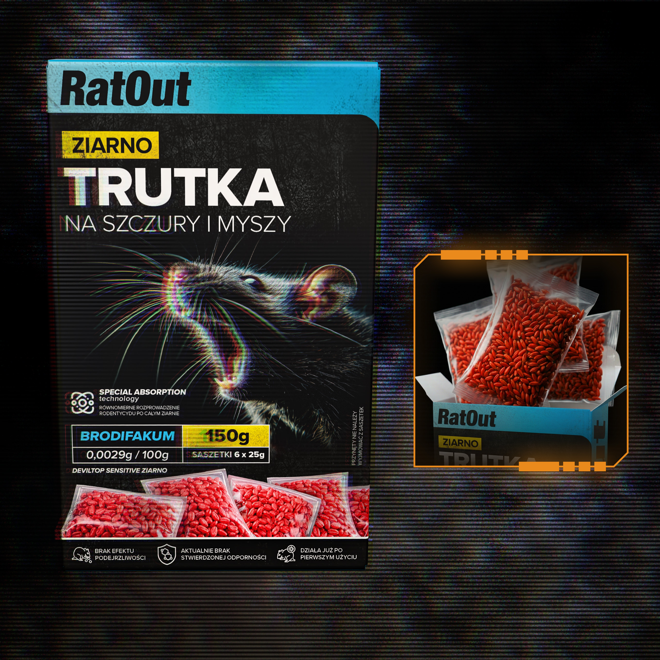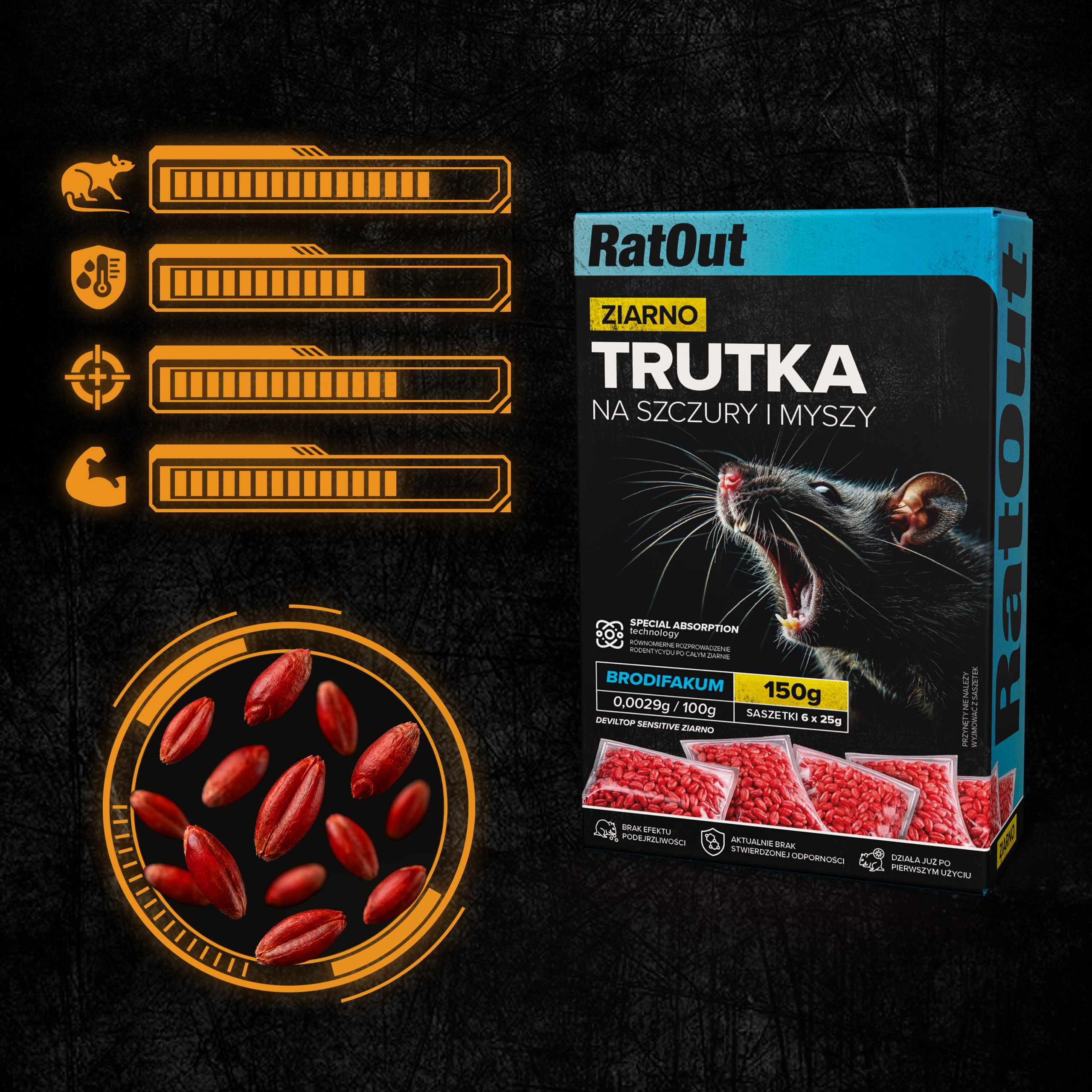 Zatrute ziarno RatOut® to profesjonalna trutka na szczury i myszy oparta na brodifakum (0,0029 g/100 g). Ziarno brodifakum od RatOut® zostało zaprojektowane jako przynęta o wysokiej skuteczności w miejscach, gdzie gryzonie mają stały dostęp do naturalnego pokarmu, takich jak magazyny, spichlerze czy pomieszczenia gospodarcze. Dzięki technologii Special Absorption substancja czynna zostaje głęboko wprowadzona do struktury ziarna, a sama przynęta nie wyróżnia się na tle dostępnego pożywienia.