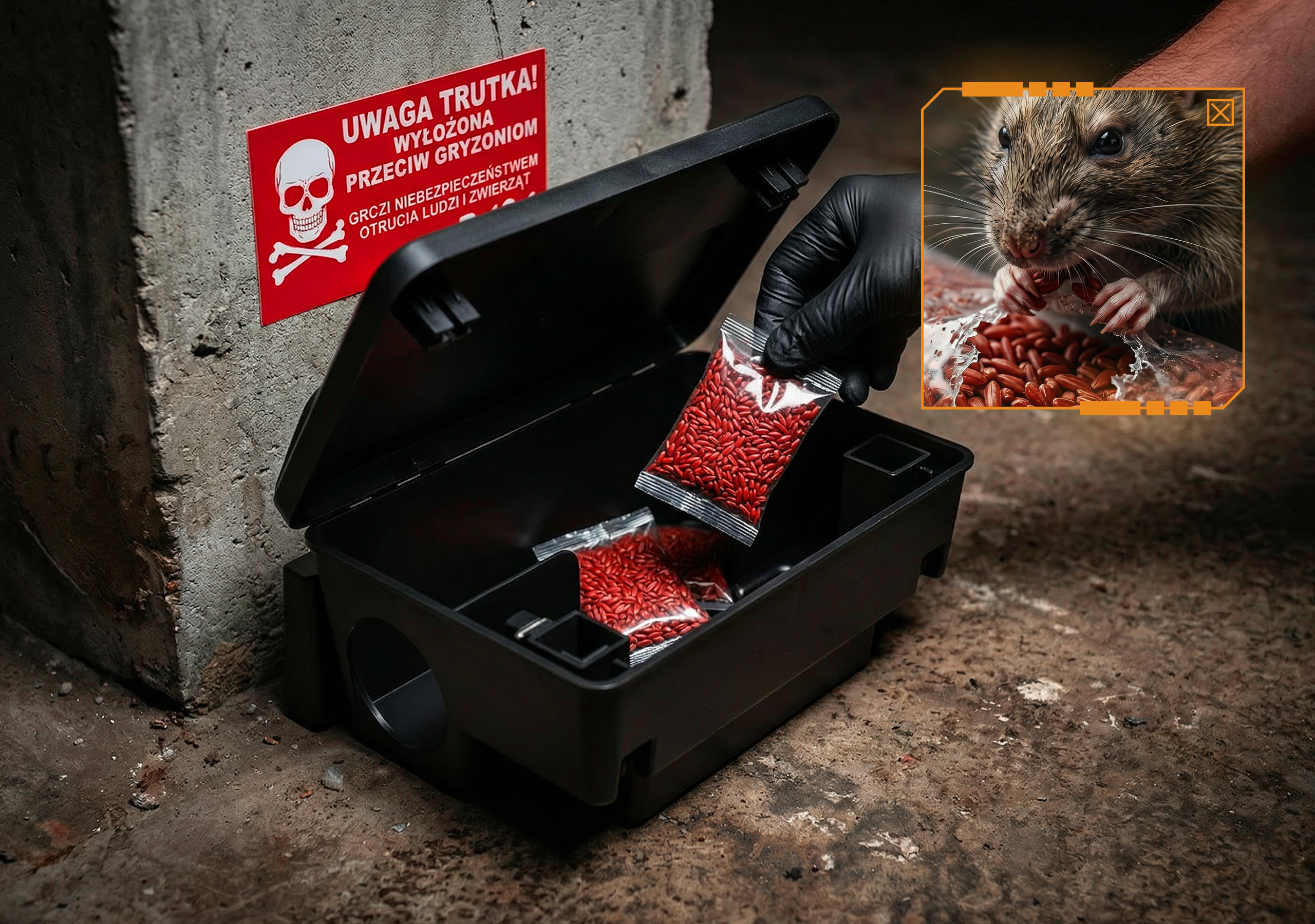 Stosować wyłącznie w zabezpieczonych stacjach deratyzacyjnych. Chronić przed dziećmi i zwierzętami.