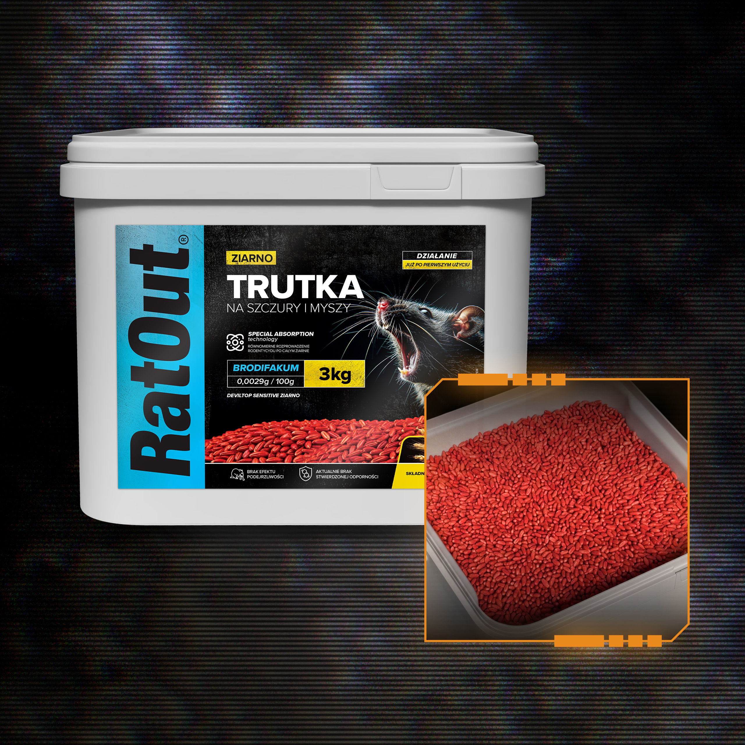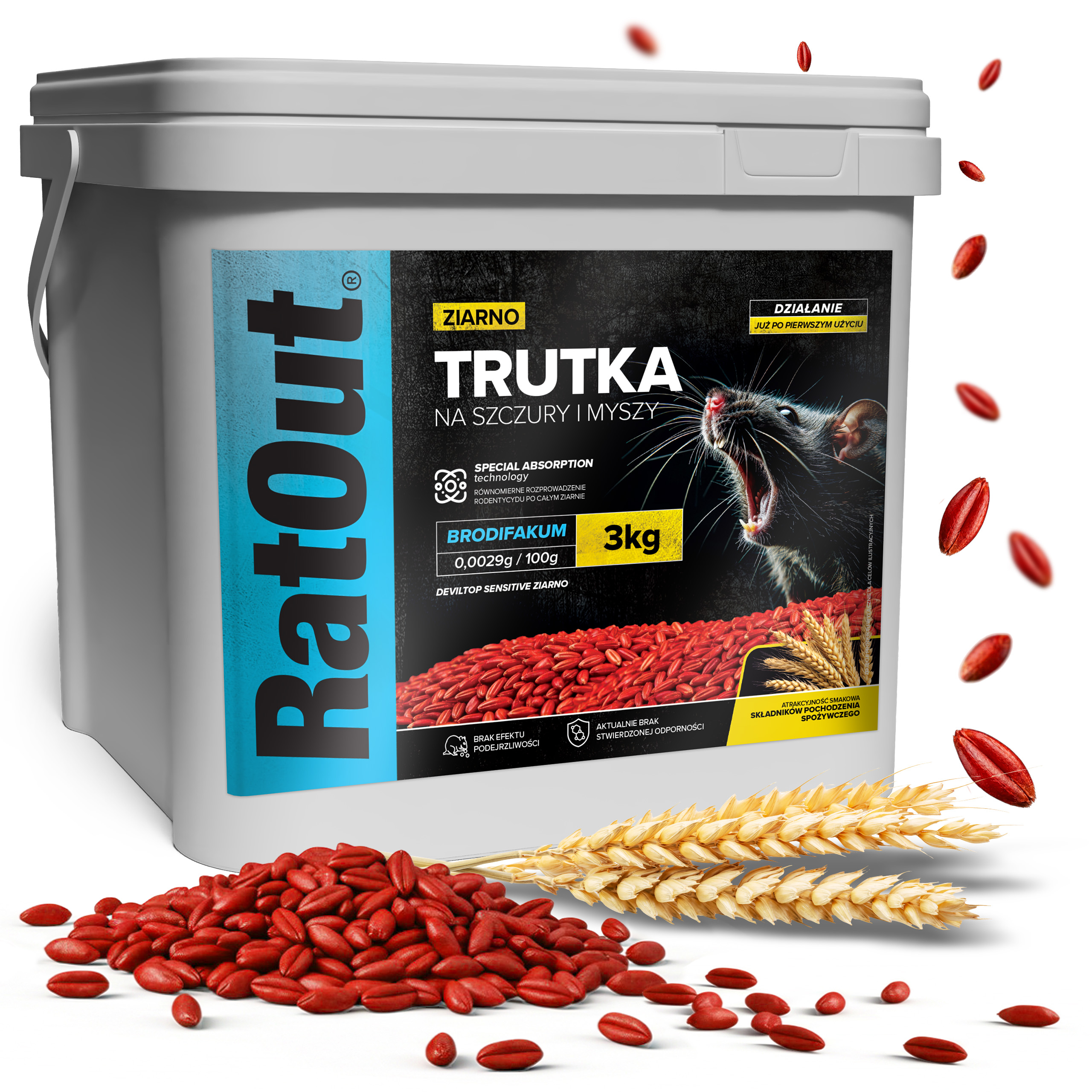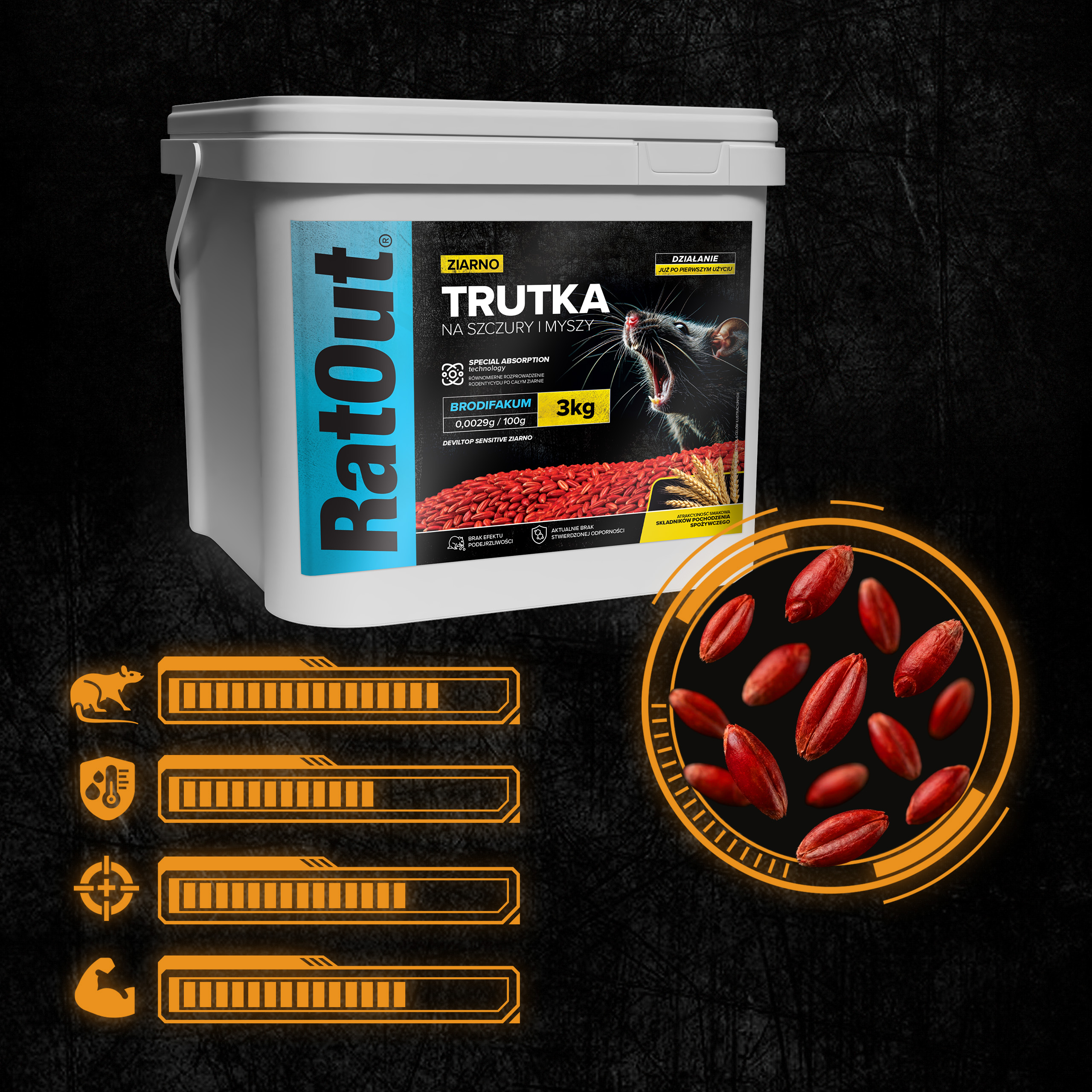 Zatrute ziarno RatOut® to profesjonalna trutka na szczury i myszy oparta na brodifakum (0,0029 g/100 g). Ziarno brodifakum od RatOut® zostało zaprojektowane jako przynęta o wysokiej skuteczności w miejscach, gdzie gryzonie mają stały dostęp do naturalnego pokarmu, takich jak magazyny, spichlerze czy pomieszczenia gospodarcze. Dzięki technologii Special Absorption substancja czynna zostaje głęboko wprowadzona do struktury ziarna, a sama przynęta nie wyróżnia się na tle dostępnego pożywienia.
