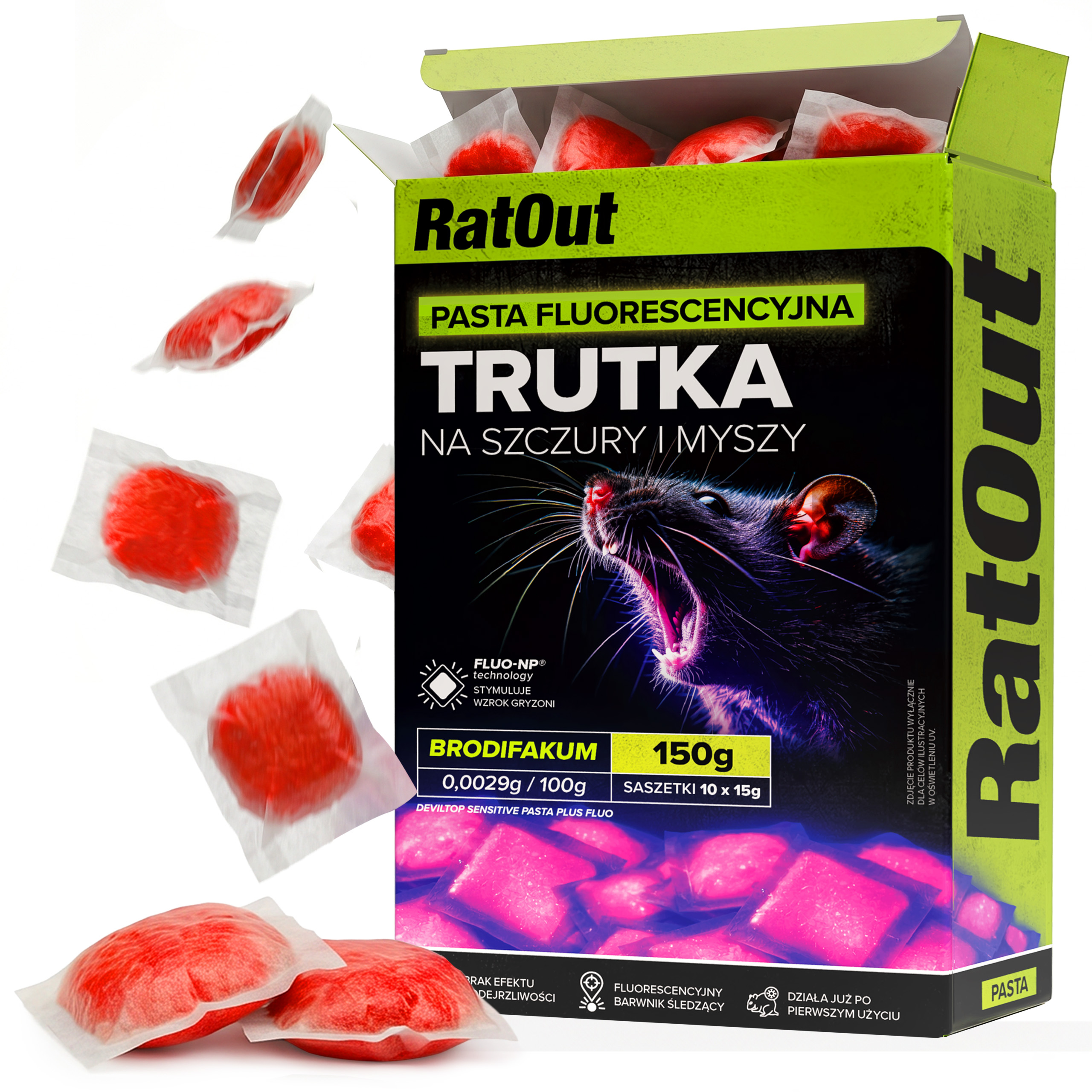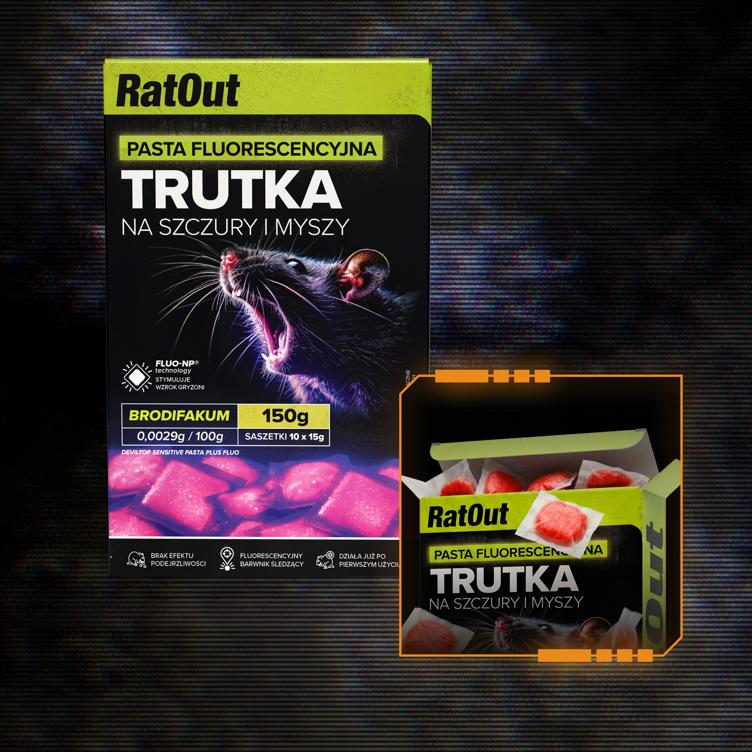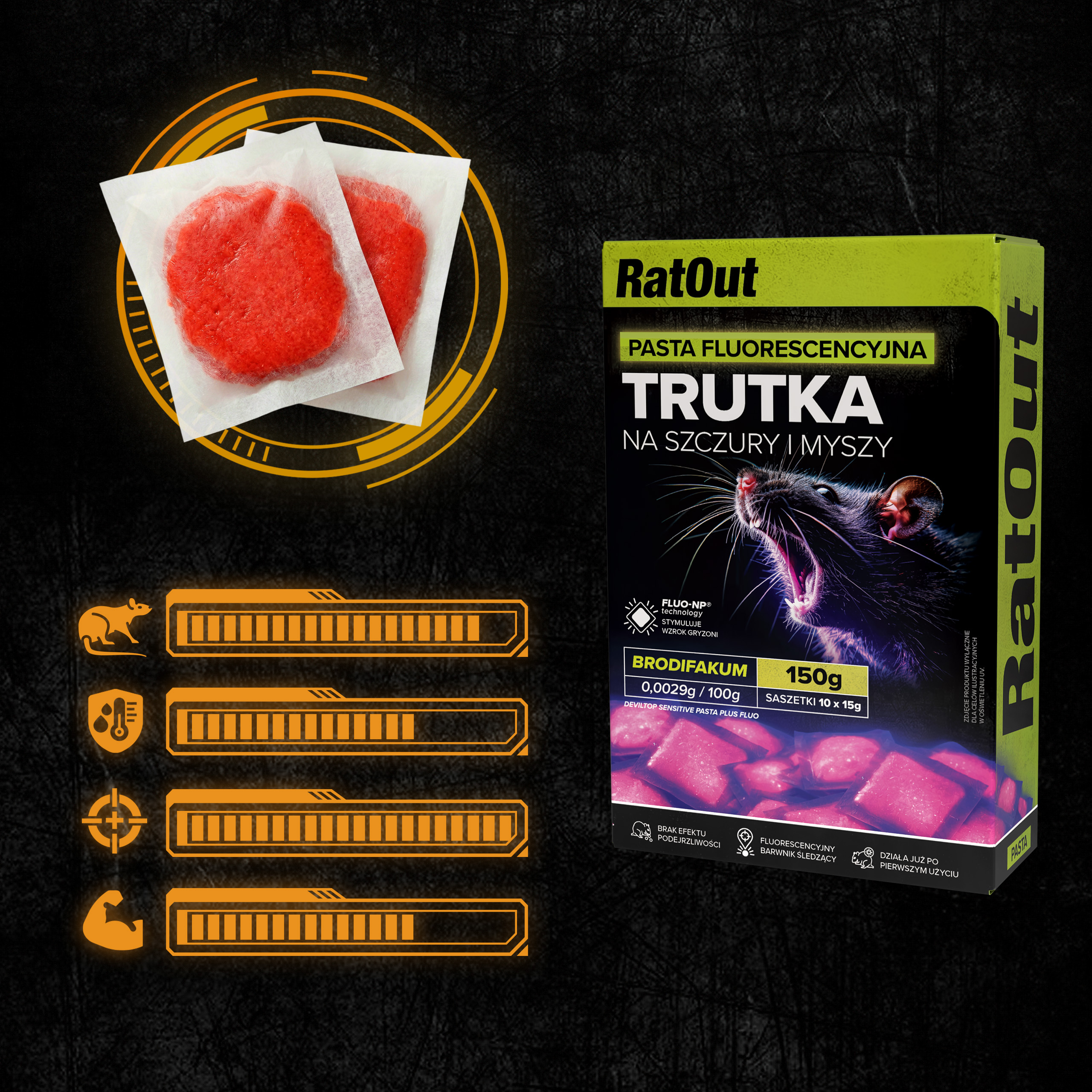 Pasta fluorescencyjna RatOut® FLUO NP to profesjonalna trutka na szczury i myszy oparta na brodifakum (0,0029 g/100 g). Pasta brodifakum od RatOut® została zaprojektowana jako przynęta o wysokiej skuteczności, która nie tylko zwalcza gryzonie, ale także umożliwia obserwację ich aktywności dzięki technologii fluorescencyjnej. Dzięki technologii FLUO-NP® przynęta jest widoczna dla gryzoni w spektrum UV i pozwala na mapowanie tras przemieszczania się szkodników poprzez fluorescencyjne odchody.