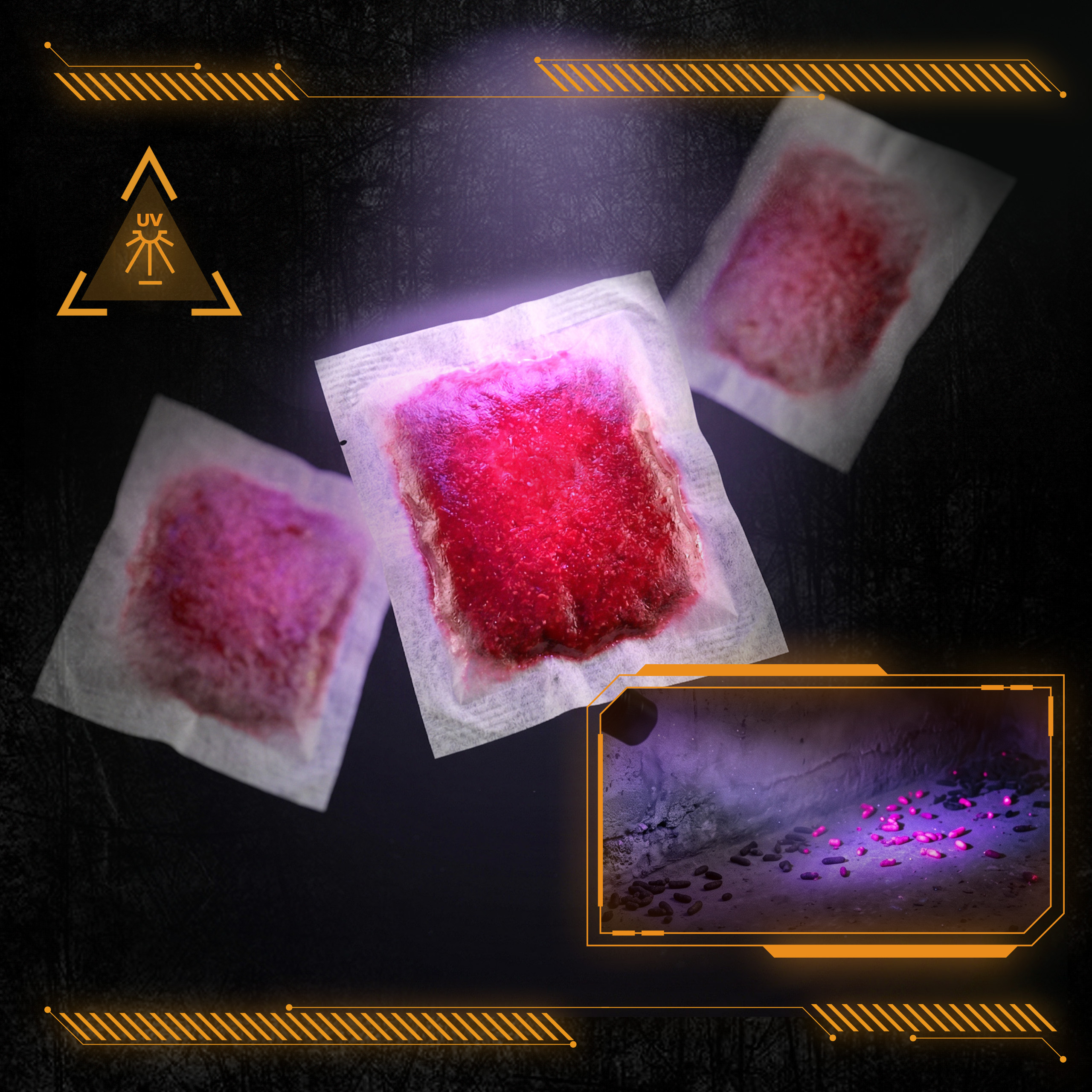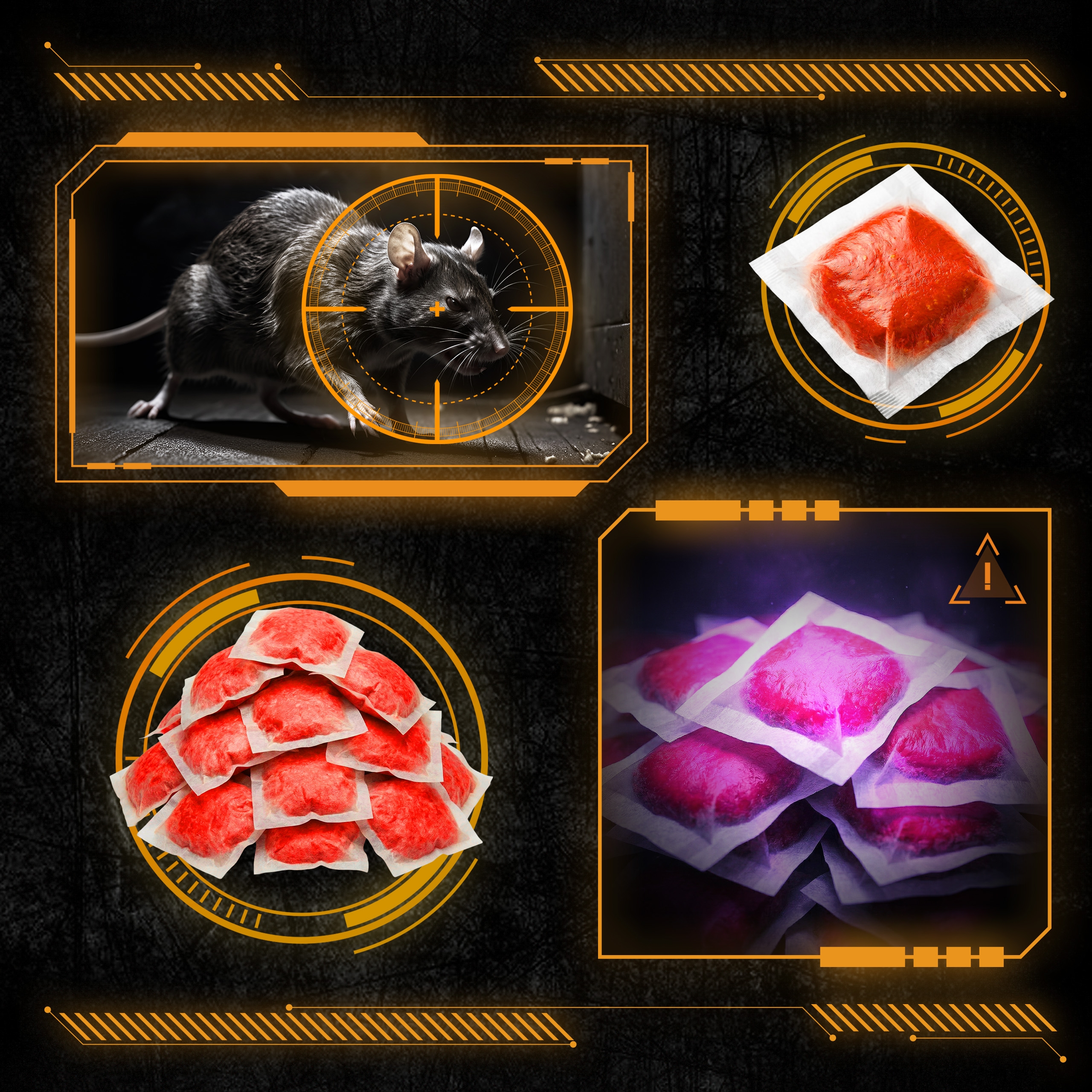 Dzięki barwnikom widocznym w świetle UV produkt nie tylko skutecznie nęci gryzonie, zachęcając do spożycia w ciemności, ale pozwala także na precyzyjne mapowanie ich tras i lokalizację gniazd poprzez świecące odchody.