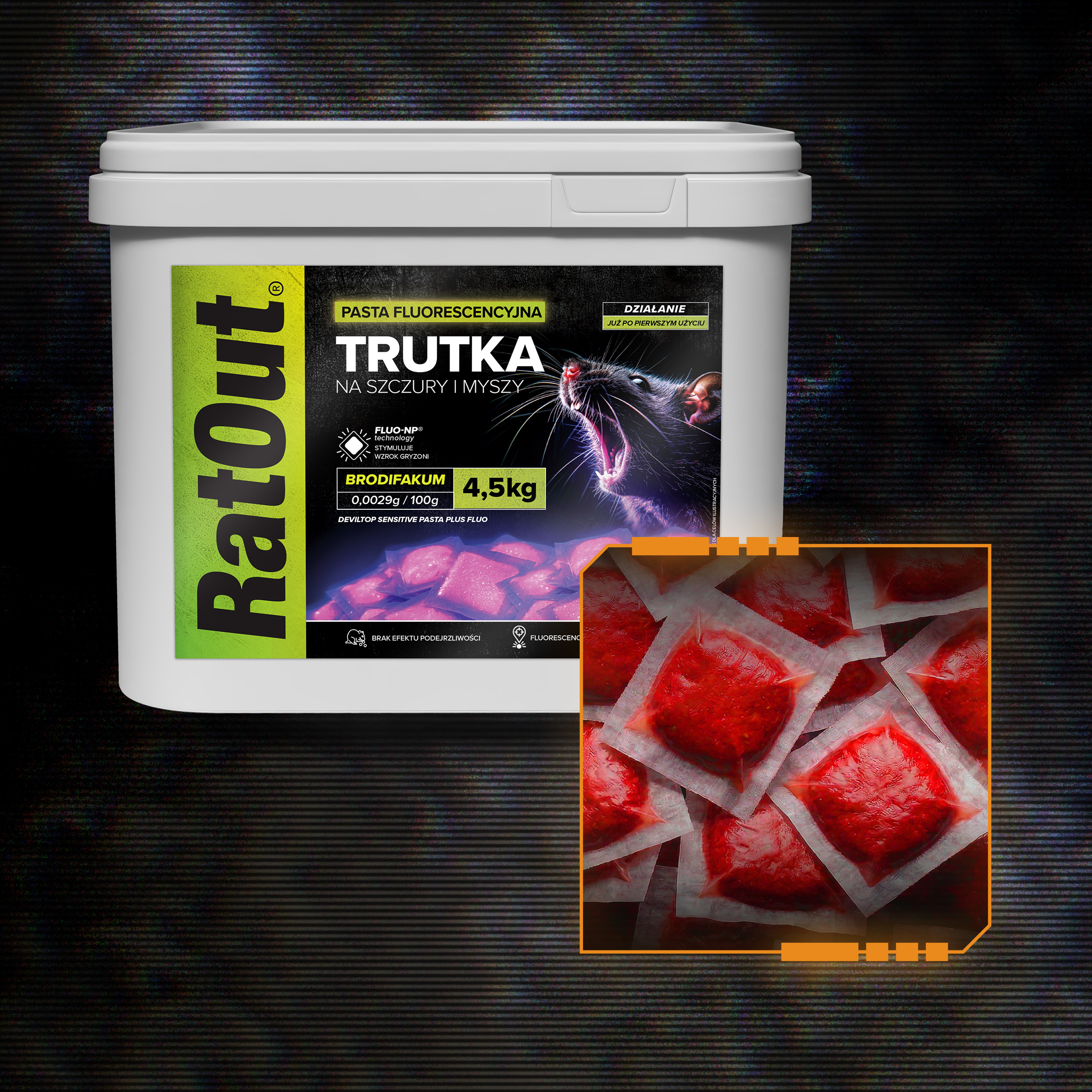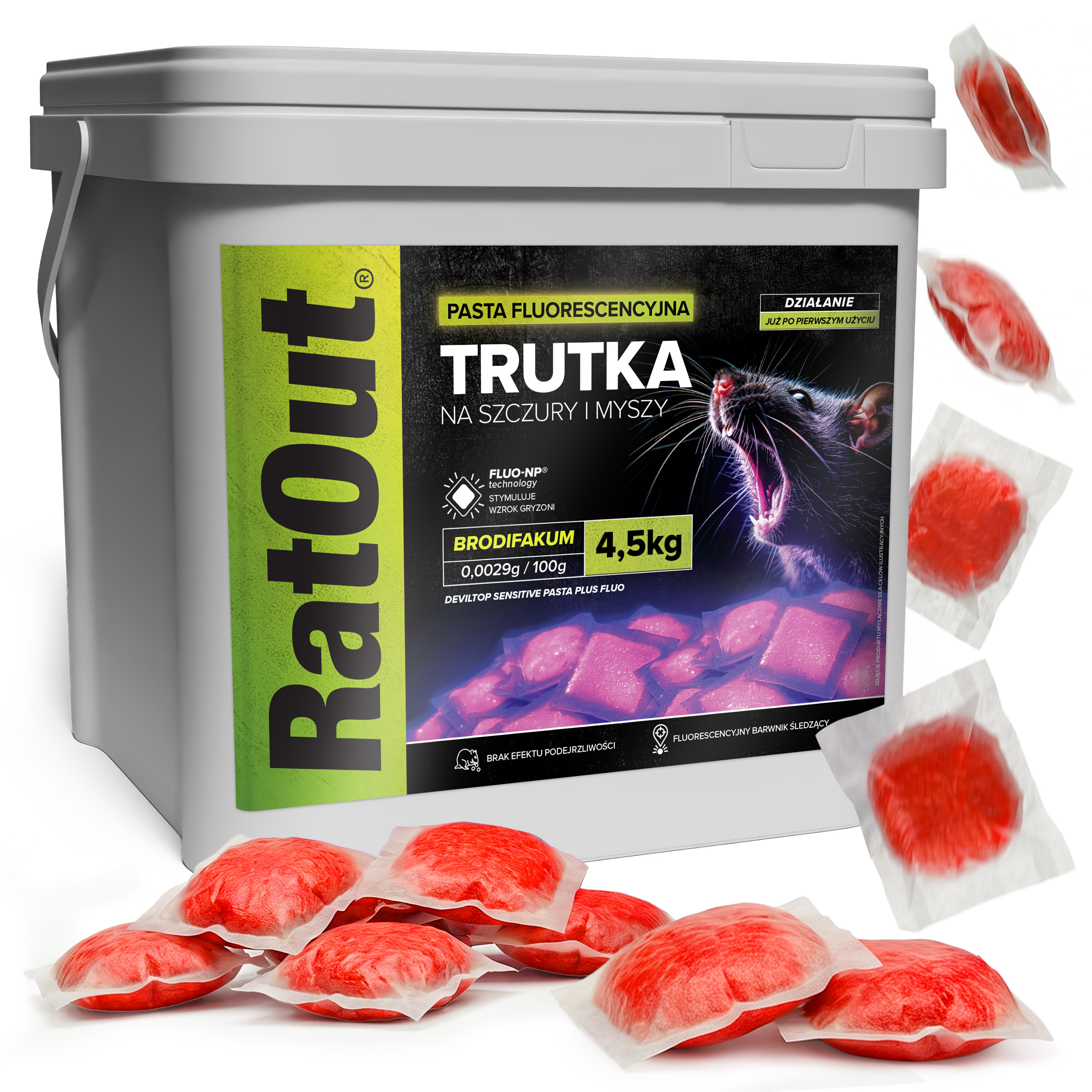 Pasta fluorescencyjna RatOut® FLUO NP to profesjonalna trutka na szczury i myszy oparta na brodifakum (0,0029 g/100 g). Pasta brodifakum od RatOut® została zaprojektowana jako przynęta o wysokiej skuteczności, która nie tylko zwalcza gryzonie, ale także umożliwia obserwację ich aktywności dzięki technologii fluorescencyjnej. Dzięki technologii FLUO-NP® przynęta jest widoczna dla gryzoni w spektrum UV i pozwala na mapowanie tras przemieszczania się szkodników poprzez fluorescencyjne odchody.