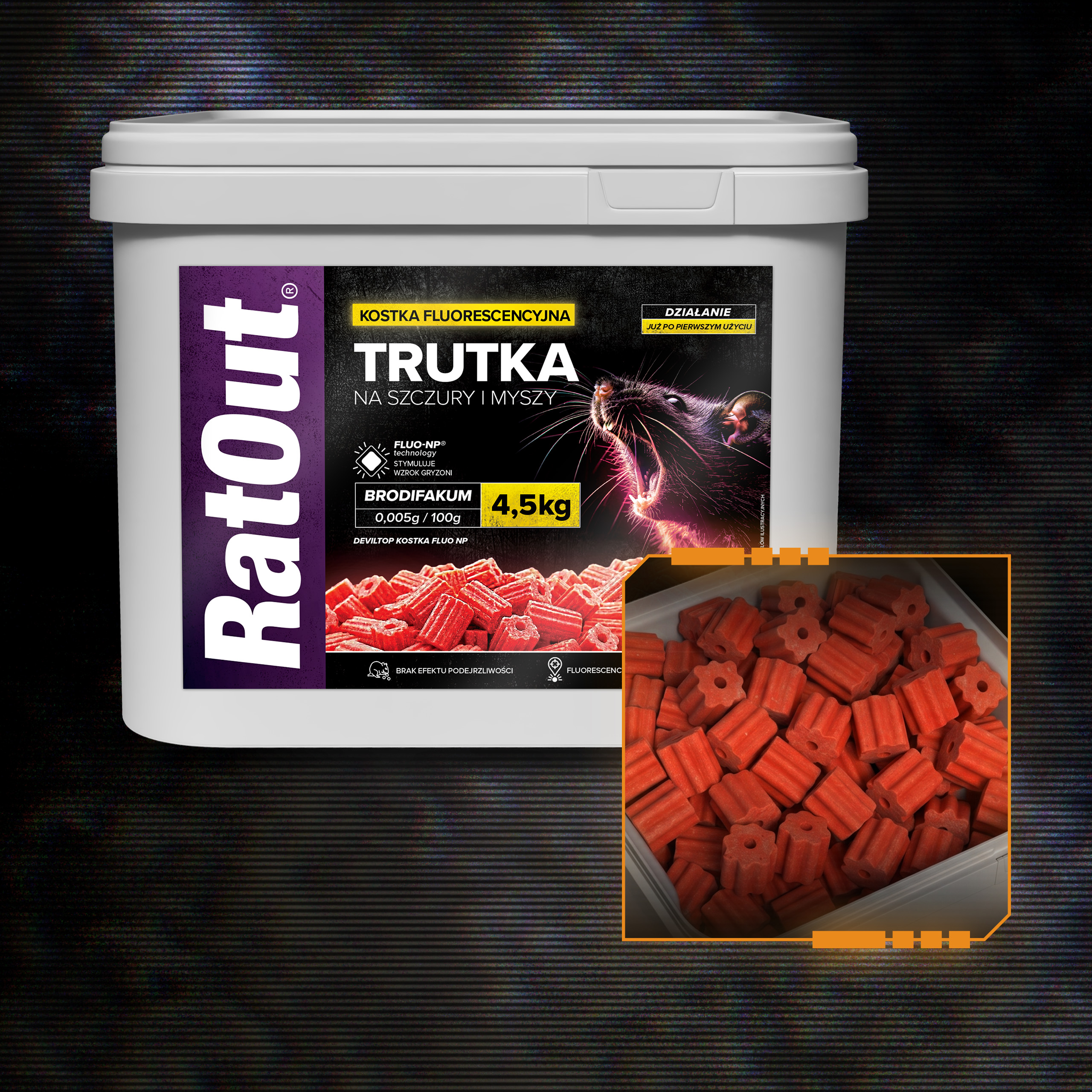 Kostka fluorescencyjna RatOut® FLUO NP to profesjonalna trutka na szczury i myszy oparta na brodifakum (0,005 g/100 g). Kostka brodifakum od RatOut® została zaprojektowana jako przynęta o wysokiej skuteczności, odporna na wilgoć, zmienną temperaturę i trudne warunki atmosferyczne. Dzięki technologii FLUO-NP® przynęta jest widoczna dla gryzoni w spektrum UV i pozwala na mapowanie tras przemieszczania się szkodników poprzez fluorescencyjne odchody.