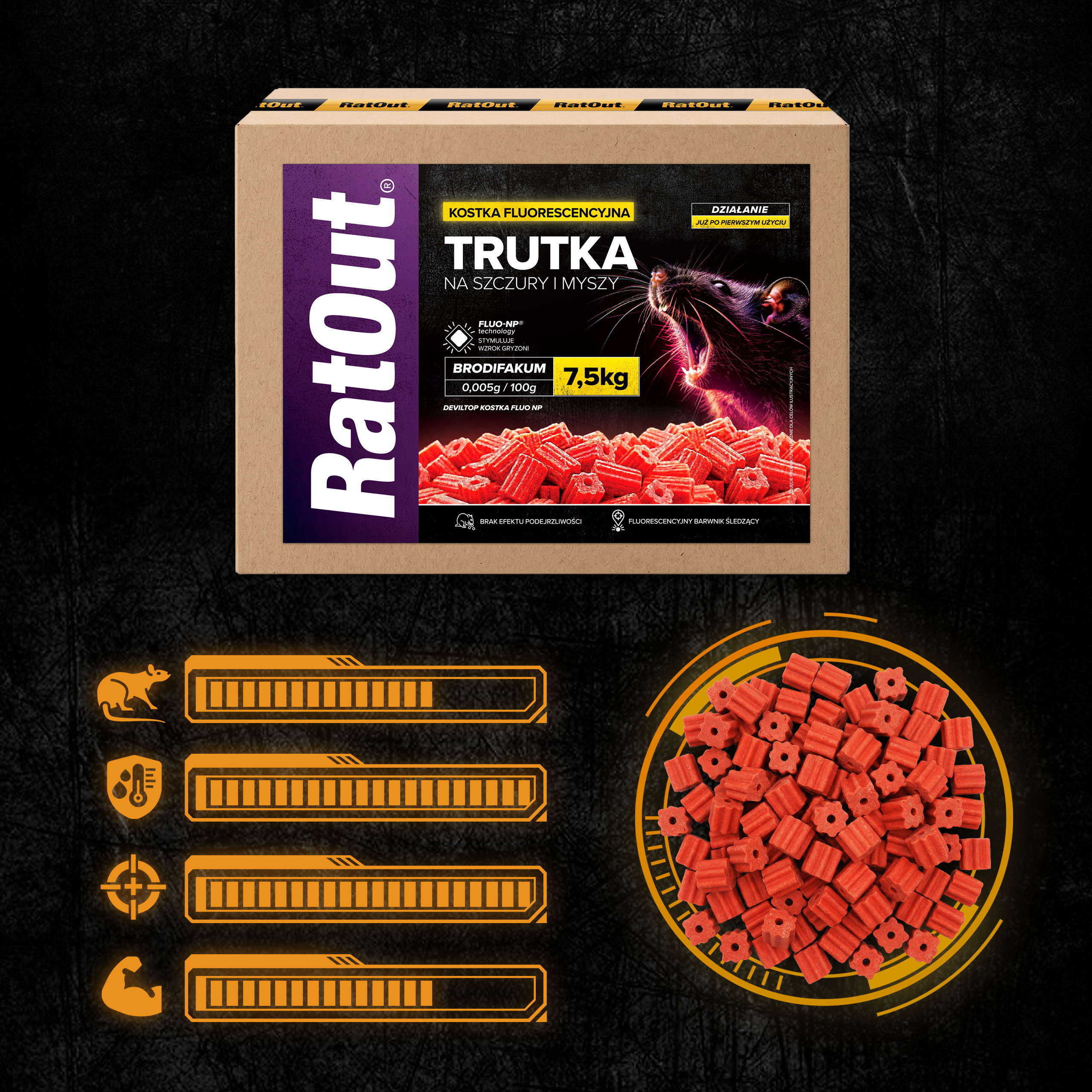 Kostka fluorescencyjna RatOut® FLUO NP to profesjonalna trutka na szczury i myszy oparta na brodifakum (0,005 g/100 g). Kostka brodifakum od RatOut® została zaprojektowana jako przynęta o wysokiej skuteczności, odporna na wilgoć, zmienną temperaturę i trudne warunki atmosferyczne. Dzięki technologii FLUO-NP® przynęta jest widoczna dla gryzoni w spektrum UV i pozwala na mapowanie tras przemieszczania się szkodników poprzez fluorescencyjne odchody.