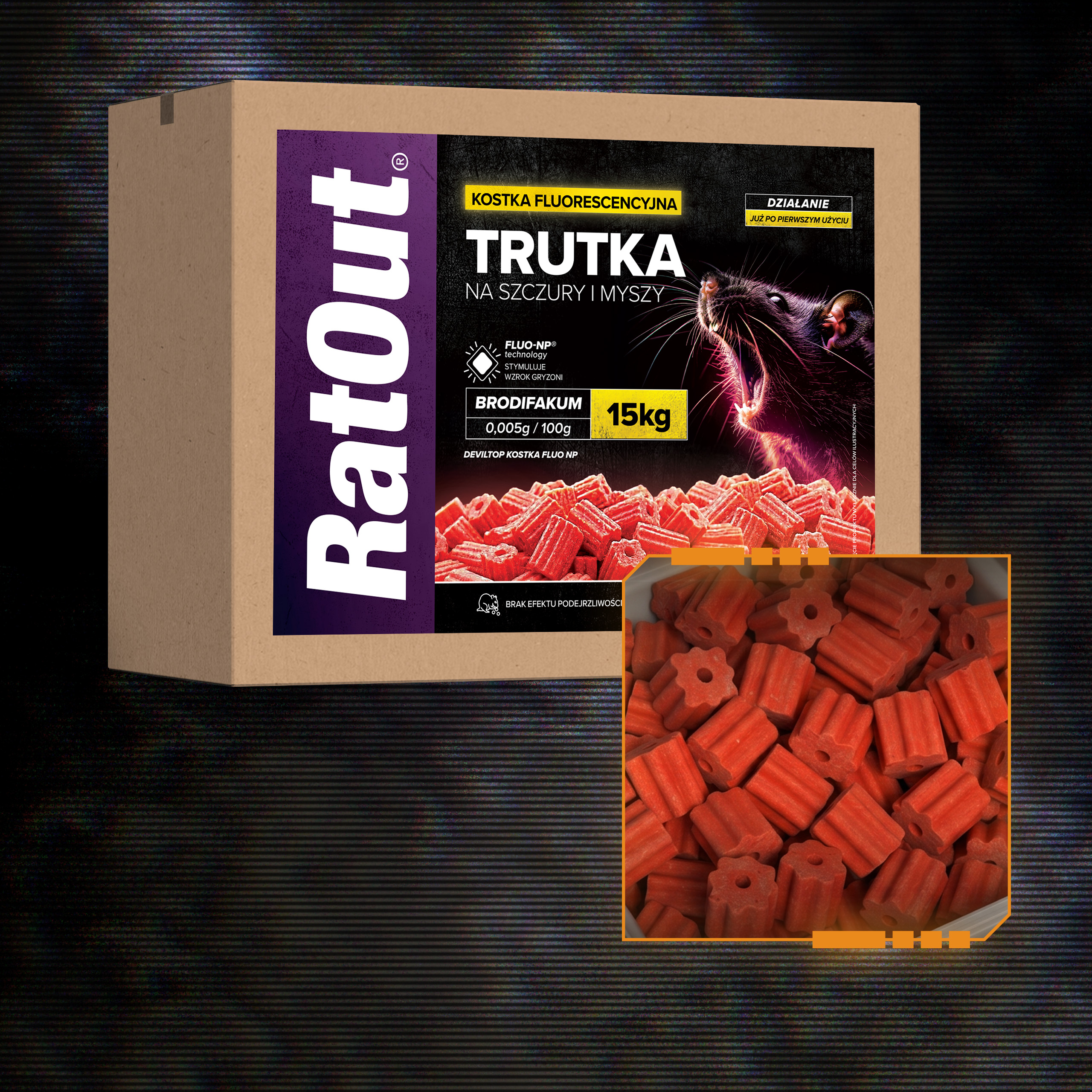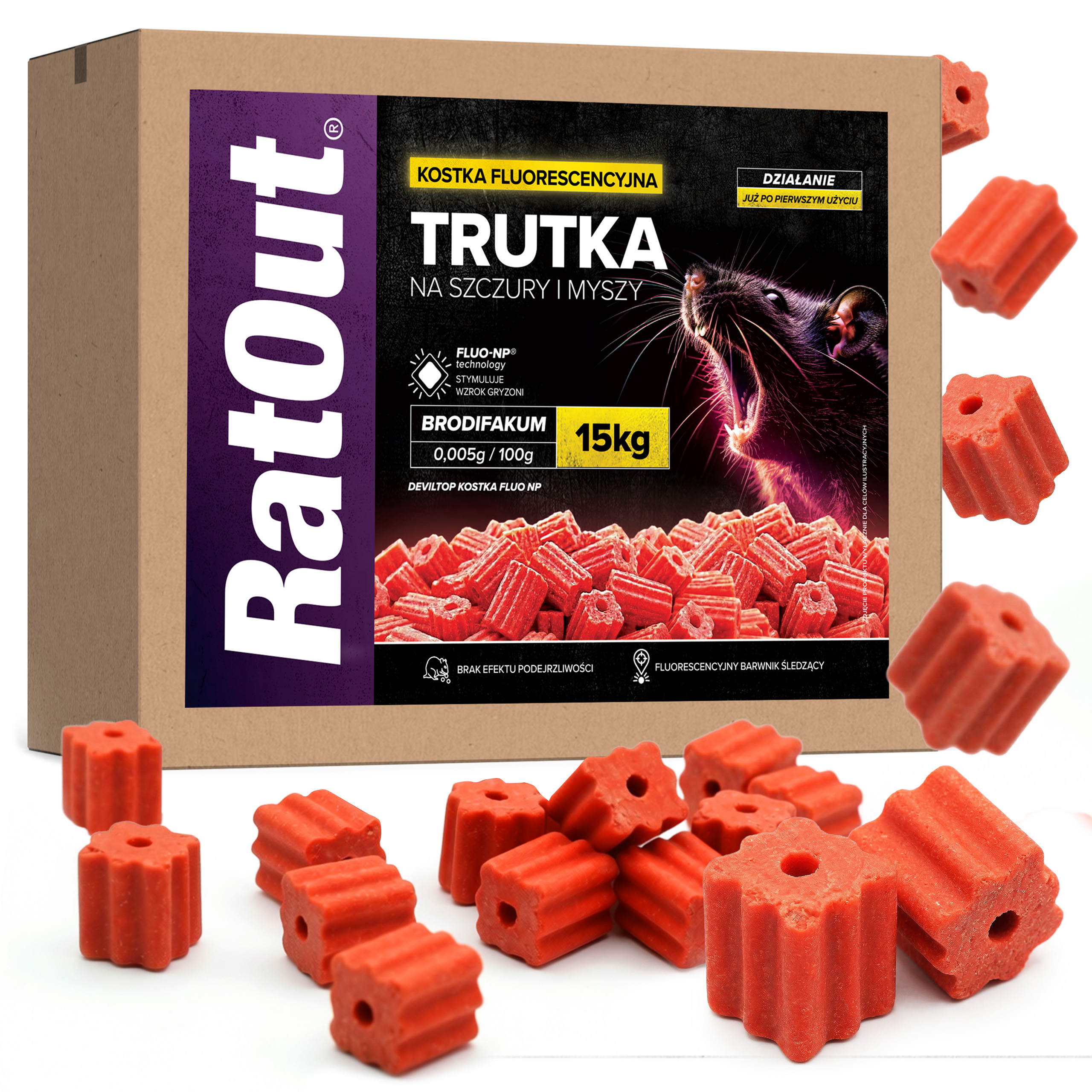 Kostka fluorescencyjna RatOut® FLUO NP to profesjonalna trutka na szczury i myszy oparta na brodifakum (0,005 g/100 g). Kostka brodifakum od RatOut® została zaprojektowana jako przynęta o wysokiej skuteczności, odporna na wilgoć, zmienną temperaturę i trudne warunki atmosferyczne. Dzięki technologii FLUO-NP® przynęta jest widoczna dla gryzoni w spektrum UV i pozwala na mapowanie tras przemieszczania się szkodników poprzez fluorescencyjne odchody.