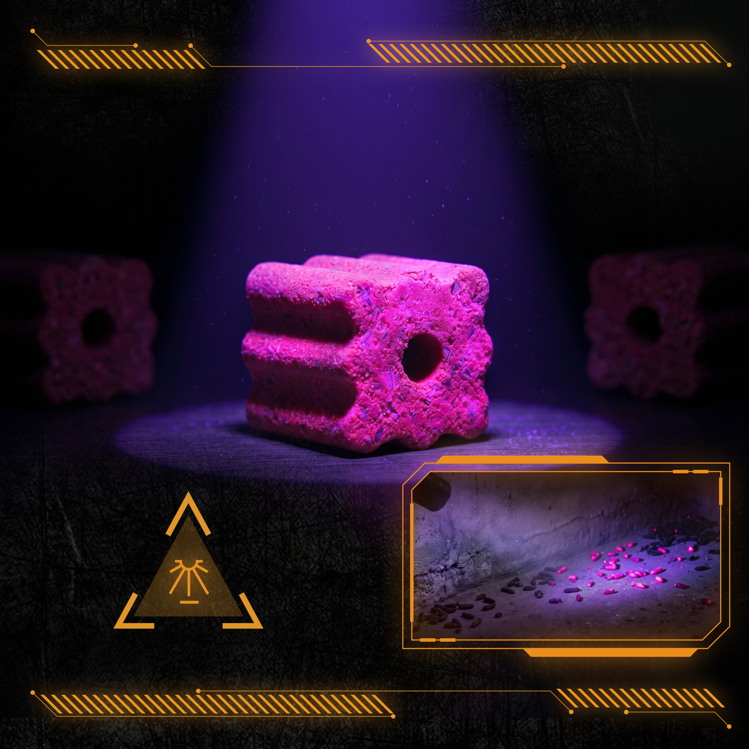Mapowanie UV: Koniec z działaniem po omacku. Po spożyciu kostki fluo odchody gryzoni świecą w świetle UV, co pozwala precyzyjnie namierzyć gniazda i ich ukryte ścieżki.